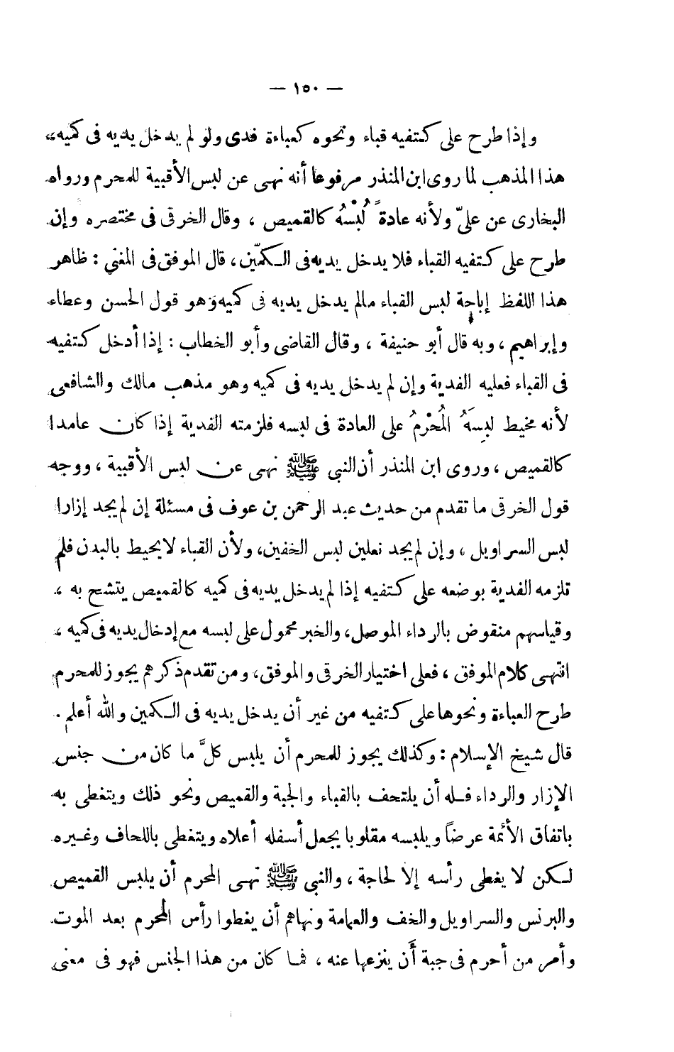 وإذا طرح على كتفيه قباء ونحوه كعباءة فدى ولو لم يدخل يديه في كميه، هذا المذهب لما روى ابن المنذر مرفوعاً أنه نهى عن لبس الأقبية للمحرم ورواه البخاري عن علي ولأنه عادة لبسه كالقميص، وقال الخرقي في مختصره وإن طرح على كتفيه القباء فلا يدخل يديه في الكمين، قال الموفق في المغني: ظاهر هذا اللفظ إباحة لبس القباء ما لم يدخل يديه في كميه وهو قول الحسن وعطاء وإبراهيم، وبه قال أبو حنيفة، وقال القاضي وأبو الخطاب: إذا أدخل كتفيه في القباء فعليه الفدية وإن لم يدخل يديه في كميه وهو مذهب مالك والشافعي لأنه مخيط لبسه المحرم على العادة في لبسه فلزمته الفدية إذا كان عامداً كالقميص، وروى ابن المنذر أن النبي صلى الله عليه وسلم نهى عن لبس الأقبية، ووجه قول الخرقي ما تقدم من حديث عبد الرحمن بن عوف في مسألة إن لم يجد إزاراً لبس السراويل، وإن لم يجد نعلين لبس الخفين، ولأن القباء لا يحيط بالبدن فلم تلزمه الفدية بوضعه على كتفيه إذا لم يدخل يديه في كميه كالقميص يتشح به، وقياسهم منقوض بالرداء الموصل، والخبر محمول على لبسه مع إدخال يديه في كميه، انتهى كلام الموفق، فعلى اختيار الخرقي والموفق، ومن تقدم ذكرهم يجوز للمحرم طرح العباءة ونحوها على كتفيه من غير أن يدخل يديه في الكمين والله أعلم.