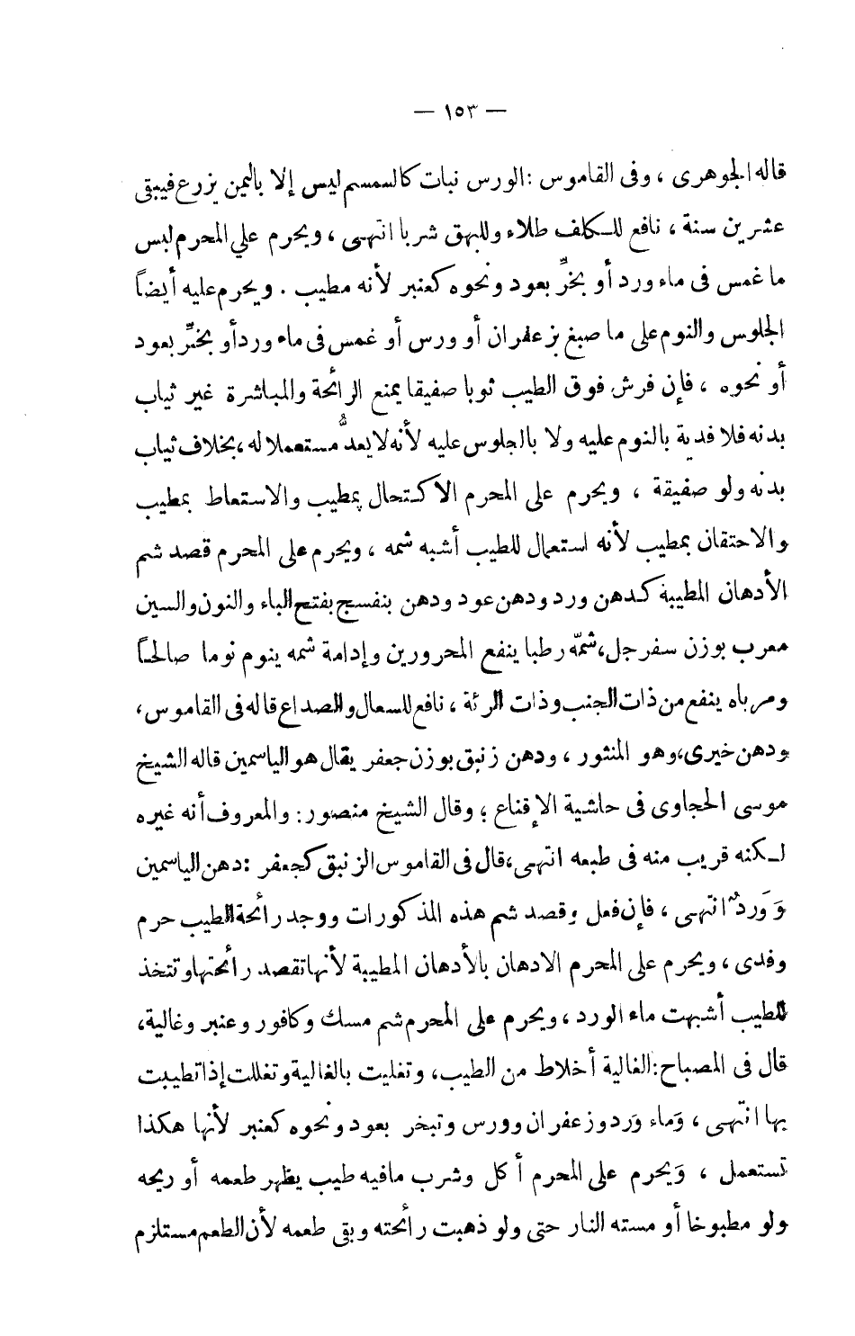 قاله الجوهري، وفي القاموس: الورس نبات كالسمسم ليس إلا باليمن يزرع فيبقى عشرين سنة، نافع للكلف طلاء وللبهق شرباً انتهى. ويحرم على المحرم لبس ما غمس في ماء وردد أو بخر بعود ونحوه كعنبر لأنه مطيب، ويحرم عليه أيضاً الجلوس والنوم على ما صبغ بزعفران أو ورس أو غمس في ماء ورد أو بخر بعود أو نحوه، فإن فرش فوق الطيب ثوباً صفيقاً يمنع الرائحة والمباشرة غير ثياب بدنه فلا فدية بالنوم عليه ولا بالجلوس عليه لأنه لا يعد مستعملا له، بخلاف ثياب بدنه ولو صفيقة، ويحرم على المحرم الاكتحال بمطيب والاستعاط بمطيب والاحتقان بمطيب لأنه استعمال للطيب أشبه شمه، ويحرم على المحرم قصد شم الأدهان المطيبة كدهن ورد ودهن عود ودهن بنفسج بفتح الباء والنون والسين معرب بوزن سفرجل، شمه رطباً ينفع المحرورين وإدامة شمه ينوم نوماً صالحاً ومرباه ينفع من ذات الجنب وذات الرئة، نافع للسعال والصداع قاله في القاموس، ودهن خيري، وهو المنثور، ودهن زنبق بوزن جعفر يقال هو الياسمين قاله الشيخ موسى الحجاوي في حاشية الإقناع، وقال الشيخ منصور: والمعروف أنه غيره لكنه قريب منه في طبعه انتهى. قال في القاموس الزنبق كجعفر: دهن الياسمين وورد انتهى.