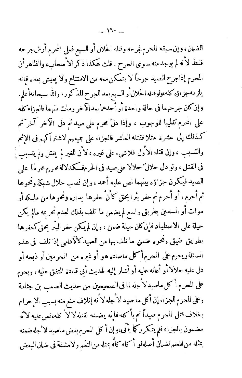وإن كان جرحهما في حالة واحدة أو أحدهما بعد الآخر ومات منهما فالجزاء كله على المحرم تغليباً للوجوب، وإذا دل محرم محرماً على صيد ثم دل الآخر آخراً ثم كذلك إلى عشرة مثلاً فقتله العاشر فالجزاء على جميعهم لاشتراكهم في الإثم والتسبب في القتل، ولو دل حلالُ حلالاً على صيد في الحرم فكدلالة محرم محرماً على الصيد فيكون جزاؤه بينهما نص عليه أحمد، وإن نصب حلال شبكة ونحوها ثم أحرم، أو أحرم ثم حفر بئراً بحق كأن حفرها بداره ونحوها من ملكه أو موات أو للمسلمين بطريق واسع لم يضمن ما تلف بذلك لعدم تحريمه ما لم يكن حيلة على الاصطياد فإن كان حيلة ضمن، وإن لم يكن حفر البئر بحق كحفرها بطريق ضيق ونحوه ضمن ما تلف بها من الصيد كالآدامي إذا تلف في هذه المسألة ويحرم على المحرم أكل ما صاده هو أو غيره من المحرمين أو ذبحه أو دل عليه حلالاً أو أعانه عليه أو أشار إليه لحديث أبي قتادة المتفق عليه، ويحرم على المحرم أكل ما صيد لأجله لما في الصحيحين من حديث الصعب بن جثامة وعلى المحرم الجزاء إن أكل ما صيد لأجله لأنه إتلاف منع منه بسبب الإحرام بخلاف قتل المحرم صيداً ثم يأكله فإنه يضمنه لقتله لا لأكله، نص عليه لأنه مضمون بالجزاء فلم يتكرر كما يأتي، وإن أكل المحرم بعض ما صيد لأجله ضمنه بمثله من اللحم لضمان أصله لو أكله كله بمثله من النعم ولا مشقة في ضمان البعض
