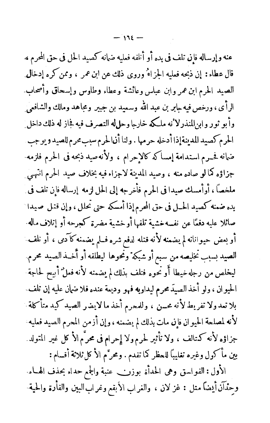 ولنا أن الحرم سبب محرم للصيد ويوجب ضمانه فحرم استدامة إمساكه كالإحرام، ولأنه صيد ذبحه في الحرم فلزمه جزاؤه كما لو صاده منه، وصيد المدينة لا جزاء فيه بخلاف صيد الحرم انتهى ملخصاً، أو أمسك صيداً في الحرم فأخرجه إلى الحل لزمه إرساله فإن تلف في يده ضمنه كصيد الحل في حق المحرم إذا أمسكه حتى تحلل، وإن قتل صيداً صائلا عليه دفعا عن نفسه خشية تلفها أو خشية مضرة كجرحه أو إتلاف ماله أو بعض حيواناته لم يضمنه لأنه قتله لدفع شره فلم يضمنه كآدمي، أو تلف الصيد بسب تخليصه من شبع أو شبكة ونحوها ليطلقه أو أخذ الصيد محرم ليخلص من رجله خيطاً أو نحوه فتلف بذلك لم يضمنه لأن فعل أبيح لحاجة الحيوان، ولو أخذ الصيد محرم ليداويه فهو وديعة عنده فلا ضمان عليه إن تلف بلا تعد ولا تفريط لأنه محسن، وللمحرم أخذ ما لا يضر الصيد كيد متآكلة لأنه مصلحة الحيوان فإن مات بذلك لم يضمنه، وإن أزمن المحرم الصيد فعليه جزاؤه لأنه كتالف، ولا تأثير لحرم ولا إحرام في محرم الأكل غير المتولد بين مأكول وغيره تغليباً للحظر كما تقدم، ومحرَّم الأكل ثلاثة أقسام: