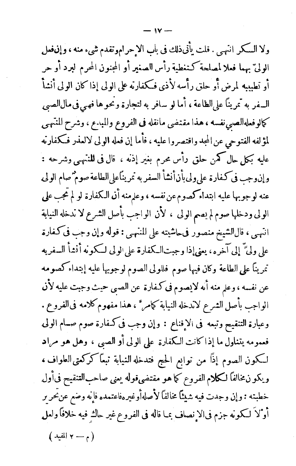 وعبارة التنقيح وتبعه في الإقناع: وإن وجب في كفارة صوم صام الولي فعمومه يتناول ما إذا كانت الكفارة على الولي أو الصبي، وهل هو مراد لكون الصوم إذاً من توابع الحج فتدخله النيابة تبعاً كركعتي الطواف، ويكون مخالفاً لكلام الفروع كما هو مقتضى قوله، يعني صاحب التنقيح في أول خطبته: وإن وجدت فيه شيئاً مخالفاً لأصله أو غيره فاعتمده فإنه وضع عن تحرير أوْ لا لكونه جزم في الإنصاف بما قاله في الفروع غير حاكٍ فيه خلافاً، ولعل