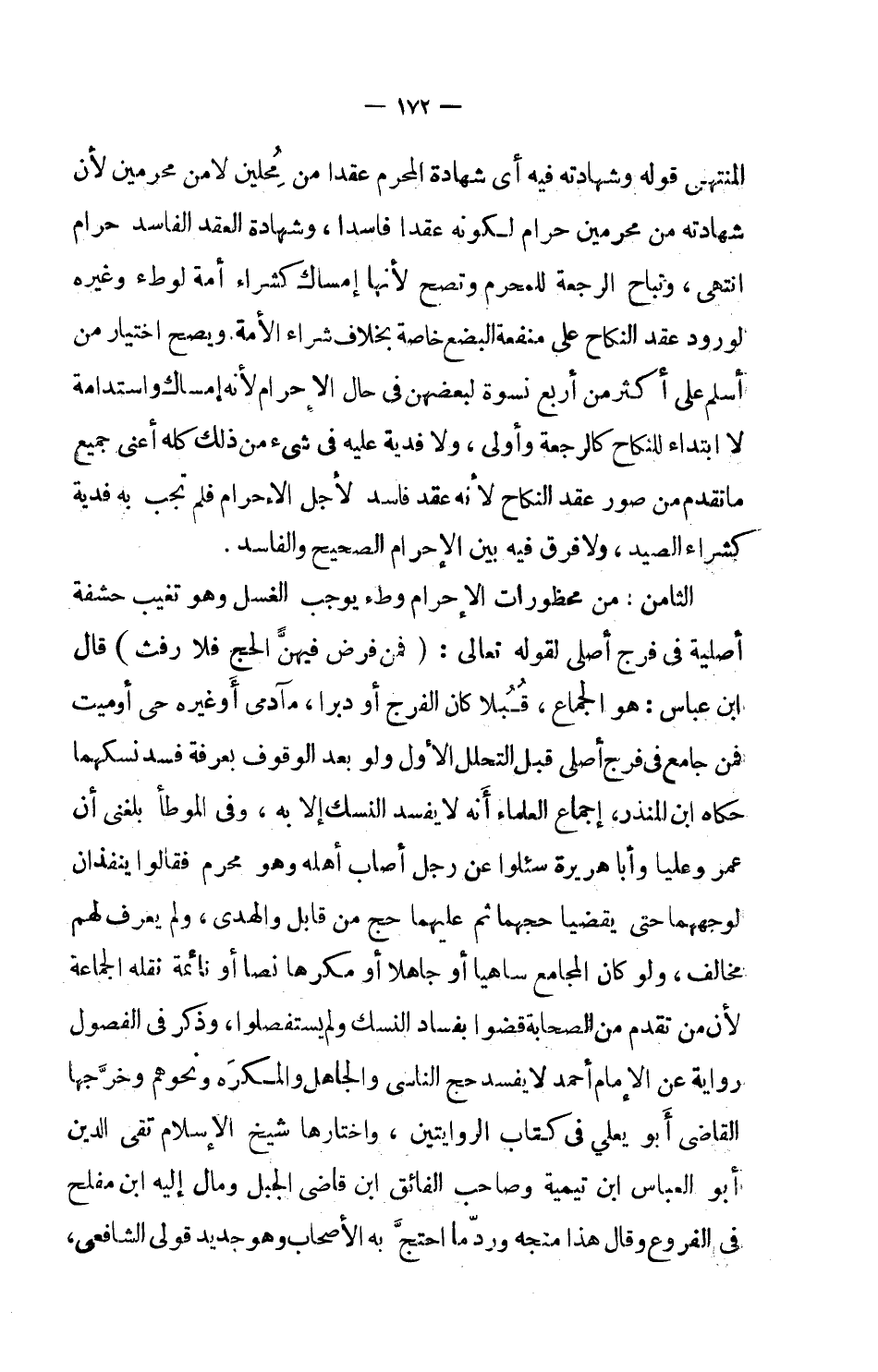 الثامن: من محظورات الإحرام وطء يوجب الغسل وهو تغييب حشفة أصلية في فرج أصلي لقوله تعالى: (فمن فرض فيهنَّ الحج فلا رفث) قال ابن عباس: هو الجماع: قُبُلا كان الفرج أو دبرا، من آدمي أو غيره حي أو ميت فمن جامع في فرج أصلي قبل التحلل الأول ولو بعد الوقوف بعرفة فسد نسكهما حكاه ابن المنذر، إجماع العلماء أنه لا يفسد النسك إلا به، وفي الموطأ بلغني أن عمر وعليا وأبا هريرة سئلوا عن رجل أصاب أهله وهو محرم فقالوا ينفذان لوجههما حتى يقضيا حجهما ثم عليهما حج من قابل والهدي، ولم يعرف لهم مخالف، ولو كان المجامع ساهياً أو جاهلاً أو مكرماً نصا أو نائمة نقله الجماعة لأن من تقدم من الصحابة قضوا بفساد النسك ولم يستفصلوا، وذكر في الفصول رواية عن الإمام أحمد لا يفسد حج الناسي والجاهل والمكره ونحوهم وخرَّجها القاضي أبو يعلي في كتاب الروايتين، واختارها شيخ الإسلام تقي الدين أبو العباس ابن تيمية وصاحب الفائق ابن قاضي الجبل ومال إليه ابن مفلح في الفروع وقال هذا متجه ورد ما احتج به الأصحاب وهو جديد قول الشافعي،