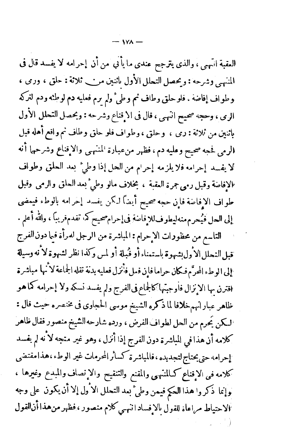 التاسع: من محظورات الإحرام: المباشرة من الرجل للمرأة فيما دون الفرج قبل التحلل الأول بشهوة باستمناء أو قُبلة أو لمس وكذا نظر لشهوة لأنه وسيلة إلى الوطء المحرَّم فكان حراماً فإن فعل فأنزل فعليه بدنة نقله الجماعة لأنها مباشرة اقترن بها الإنزال فأوجبتها كالجماع في الفرج ولم يفسد نسكه ولا إحرامه كما هو ظاهر عباراتهم خلافاً لما ذكره الشيخ موسى الحجاوي في مختصره حيث قال: لكن يحرم من الحل لطواف الفرض، ورده شارحه الشيخ منصور فقال ظاهر كلامه أن هذا في المباشرة دون الفرج إذا أنزل، وهو غير متجه لأنه لم يفسد إحرامه حتى يحتاج لتجديده، فالمباشرة كسائر المحرمات غير الوطء، هذا مقتضى كلامه في الإقناع كالمنتهى والمقنع والتنقيح والإنصاف والمبدع وغيرها، وإنما ذكروا هذا الحكم فيمن وطئ بعد التحلل الأول إلا أن يكون على وجه الاحتياط مراعاة للقول بالإفساد انتهى كلام منصور، فظهر من هذا أن القول