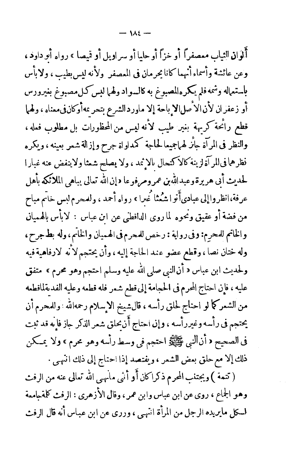 ألوان الثياب معصفراً أو خزاً أو حلياً أو سراويل أو قميصاً) رواه أبو داود، وعن عائشة وأسماء أنهما كانتا تحرمان في المعصفر ولأنه ليس بطيب، ولا بأس باستعماله وشمه فلم يكره المصبوغ به كالسواد ولهما لبس كل مصبوغ بغيرورس أو زعفران لأن الأصل الإباحة إلا ما ورد الشرع بتحريمه أو كان في معناه، ولهما قطع رائحة كريهة بغير طيب لأنه ليس من المحظورات بل مطلوب فعله، والنظر في المرآة جائز لهما جميعاً لحاجة كمداواة جرح وإزالة شعر بعينه، ويكره نظرهما في المرآة لزينة كالاكتحال بالإئمد، ولا يصلح شعثاً ولا ينفض عنه غباراً لحديث أبي هريرة وعبد الله بن عمرو مرفوعاً (إن الله تعالى يباهي الملائكة بأهل عرفة، انظروا إلى عبادي أتوا شعثاً غُبراً) رواه أحمد، وللمحرم