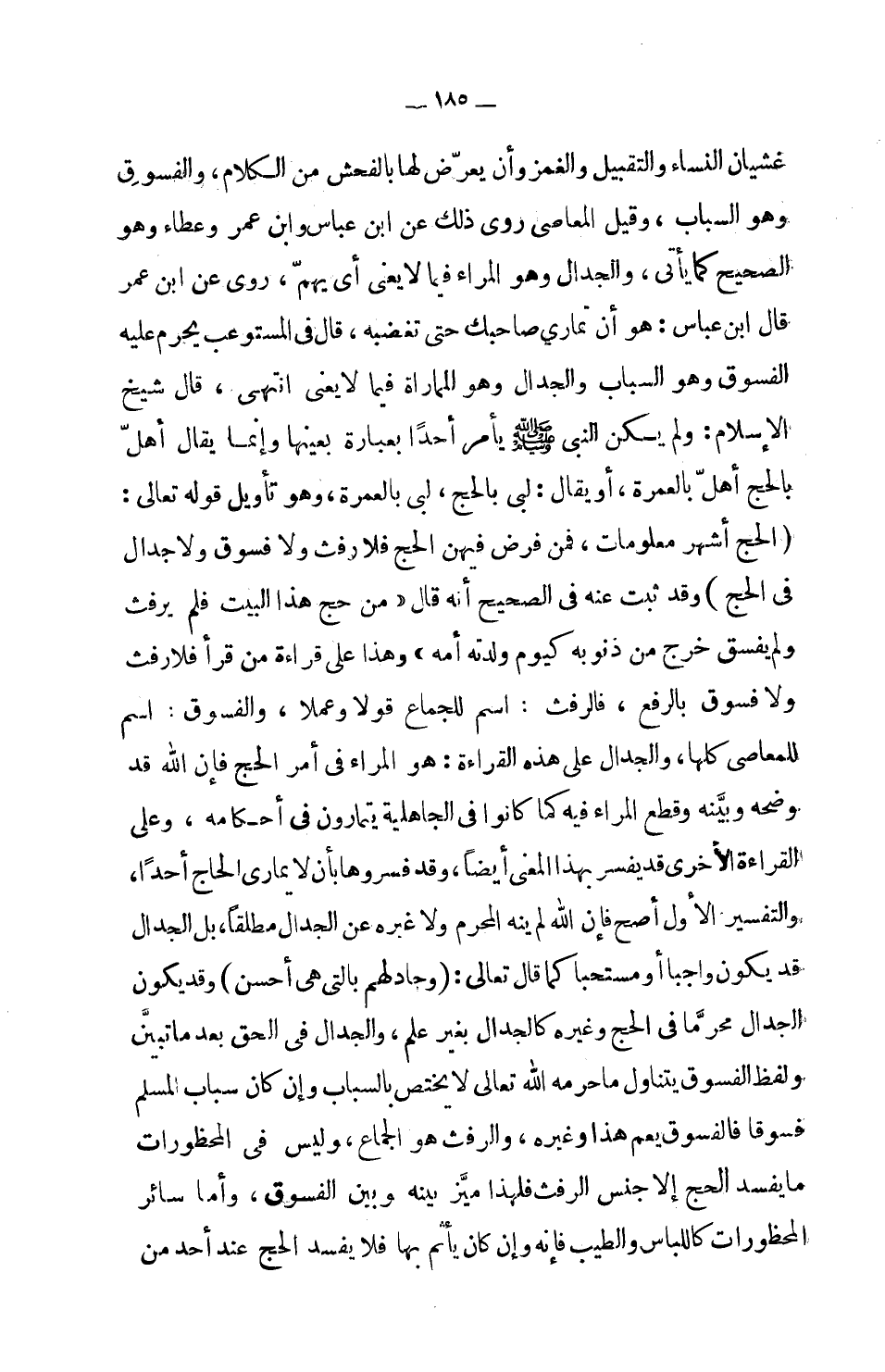 قال شيخ الإسلام: ولم يكن النبي صلى الله عليه وسلم يأمر أحداً بعبارة بعينها وإنما يقال أهلّ بالحج أهلّ بالعمرة، أو يقال: لبى بالحج، لبى بالعمرة، وهو تأويل قوله تعالى: (الحجُ أشهر معلومات فمن فرض فيهن الحج فلا رفث ولا فسوق ولا جدال في الحج) وقد ثبت عنه في الصحيح أنه قال من حج هذا البيت فلم يرفث ولم يفسق خرج من ذنوبه كيوم ولدته أمه. وهذا على قراءة من قرأ فلا رفث ولا فسوق بالرفع، فالرفث: اسم للجماع قولاً وعملاً، والفسوق: اسم للمعاصي كلها، والجدال على هذه القراءة: هو المراء في أمر الحج فإن الله قد وضحه وبيَّنه وقطع المراء فيما كما كانوا في الجاهلية يتمارون في أحكامه، وعلى القراءة الأخرى قد يفسر بهذا المعنى أيضاً، وقد فسروها بأن لا يماري الحاج أحداً، والتفسير الأول أصح فإن الله لم ينه المحرم ولا غيره عن الجدال مطلقاً، بل الجدال قد يكون واجباً أو مستحباً كما قال تعالى: (وجادلهم بالتي هي أحسن) وقد يكون الجدال محرماً في الحج وغيره كالجدال بغير علم، والجدال في الحق بعد ما تبين ولفظ الفسوق يتناول ما حرمه الله تعالى لا يختص بالسباب وإن كان سباب المسلم فسوقاً فالفسوق يعم هذا وغيره، والرفث هو الجماع، وليس في المحظورات ما يفسد الحج إلا جنس الرفث فلهذا ميز بينه وبين الفسوق، وأما سائر المحظورات كاللباس والطيب فإنه وإن كان يأثم بها فلا يفسد الحج عند أحد من