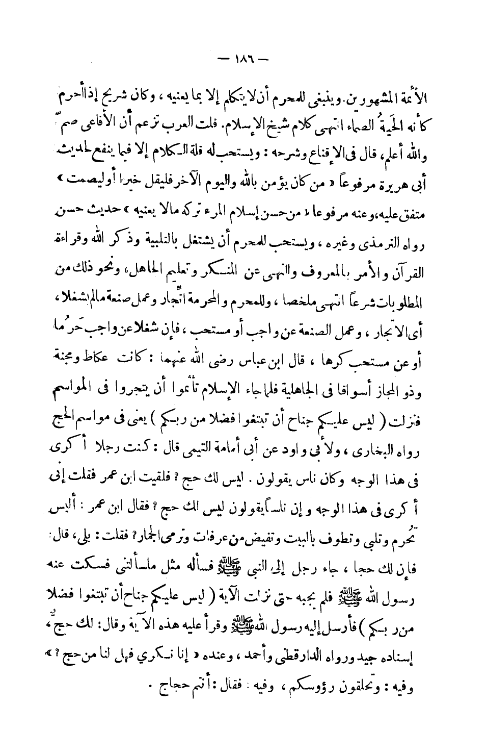 وعنه مرفوعاً (من حسن إسلام المرء تركه ما لا يعنيه) حديث حسن رواه الترمذي وغيره، ويستحب للمحرم أن يشتغل بالتلبية وذكر الله وقراءة القرآن والآمر بالمعروف والنهي عن المنكر وتعليم الجاهل، ونحو ذلك من المطلوبات شرعاً انتهى ملخصا، وللمحرم والمحرمة اتجار وعمل صنعة ما لم يشغلا، أي الاتجار، وعمل الصنعة عن واجب أو مستحب، فإن شغلا عن واجب حرما أو عن مستحب كرها، قال ابن عباس رضي الله عنهما: كان عكاظ ومجنة وذو المجاز أسواقاً في الجاهلية فلما جاء الإسلام تأثموا أن يتجروا في المواسم فنزلت (ليس عليكم جناح أن تبتغوا فضلا من ربكم) يعني في مواسم الحج رواه البخاري، ولأبي داود عن أبي أمامة التيمي قال: كنت رجلا أكرى في هذا الوجه وكان ناس يقولون. ليس لك حج فلقيت ابن عمر فقلت إني أكرى في هذا الوجه وإن ناساً يقولون ليس لك حج؟ فقال ابن عمر: أليس تحرم وتلبي وتطوف بالبيت وتفيض من عرفات وترمي الجمار؟ فقلت: بلى، قال فإن لك حجا، جاء رجل إلى النبي صلى الله عليه وسلم فسأله مثل ما سألتني فسكت عنه رسول الله صلى الله عليه وسلم فلم يجبه حتى نزلت الآية (ليس عليكم جناح أن تبتغوا فضلا من ربكم) فأرسل إليه رسول الله صلى الله عليه وسلم وقرأ عليه هذه الآية وقال: لك حج، إسناده جيد ورواه الدارقطني وأحمد، وعنده (إنا نكري فهل لنا من حج؟) وفيه: وتحلقون رؤوسكم، وفيه: فقال: أنتم حجاج.