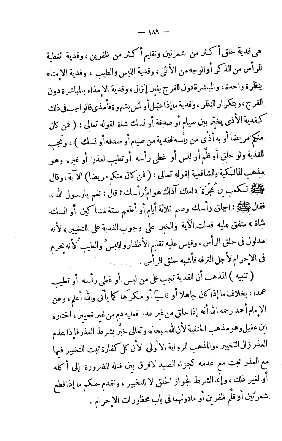 وعن الإمام أحمد رحمه الله أنه إذا حلق من غير عذر فعليه دم من غير تخيير، اختاره ابن عقيل وهو مذهب الحنفية لأن الله سبحانه وتعالى خيَّر بشرط العذر فإذا عدم العذر زال التخيير، والمذهب الرواية الأولى لأن كل كفارة ثبت التخيير فيها مع العذر ثبت مع عدمه كجزاء الصيد لا فرق بين قتله للضرورة إلى أكله أو لغير ذلك، وإنما الشرط لجواز الحلق لا للتخيير، وتقدم حكم ما إذا قطع شعرتين أو قلّم ظفرين أو ما دونهما في باب محظورات الإحرام.