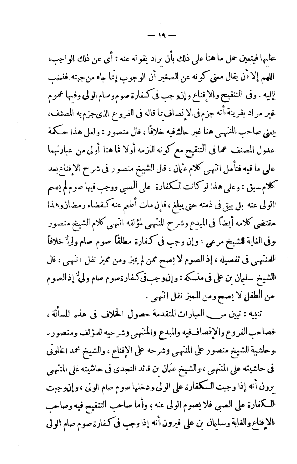 تبنيه: تبين من العبارات المتقدمة حصول الخلاف في هذه المسألة فصاحب الفروع والإنصاف فيه والمبدع والمنتهى وشرحيه للمؤلف ومنصور. وحاشية الشيخ منصور على المنتهى وشرحه على الإقناع، والشيخ محمد الخلوتي في حاشيته على المنتهى، والشيخ عثمان بن قائد النجدي في حاشيته على المنتهى يرون أنه إذا وجبت الكفارة على الولي ودخلها صوم صام الولي، وإن وجبت الكفارة على الصبي فلا يصوم الولي عنه؛ وأما صاحب التنقيح فيه وصاحب الإقناع والغاية وسليمان بن علي فيرون أنه إذا وجب في كفارة صوم صام الولي