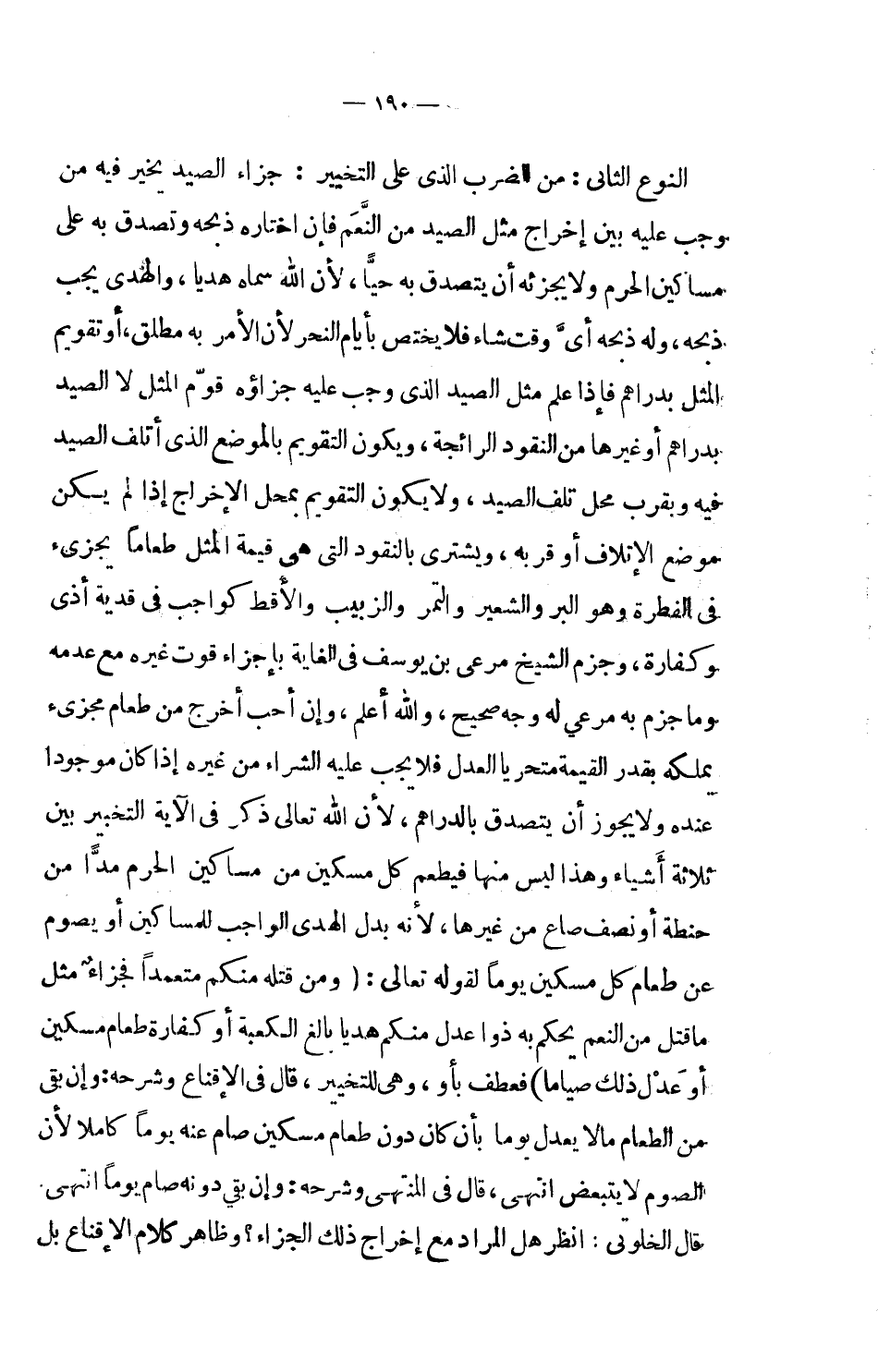 النوع الثاني: من الضرب الذي على التخيير: جزاء الصيد يخير فيه من وجب عليه بين إخراج مثل الصيد من النّعم فإن اختاره ذبحه وتصدق به على مساكين الحرم ولا يجزئه أن يتصدق به حياً، لأن الله سماه هدياً، والهدي يجب ذبحه، وله ذبحه أي وقت شاء فلا يختص بأيام النحر لأن الأمر به مطلق، أو تقويم المثل بدراهم فإذا علم مثل الصيد الذي وجب عليه جزاؤه قوّم المثل لا الصيد بدراهم أو غيرها من النقود الرائجة، ويكون التقويم بالموضع الذي أتلف الصيد فيه وبقرب محل تلف الصيد، ويكون التقويم بمحل الإخراج إذا لم يكن موضع الإتلاف أو قربه، ويشتري بالنقود التي هي قيمه المثل طعاماً يجزئ في الفطرة وهو البر والشعير والتمر والزبيب والأقط كواجب في فديه أذى وكفارة.