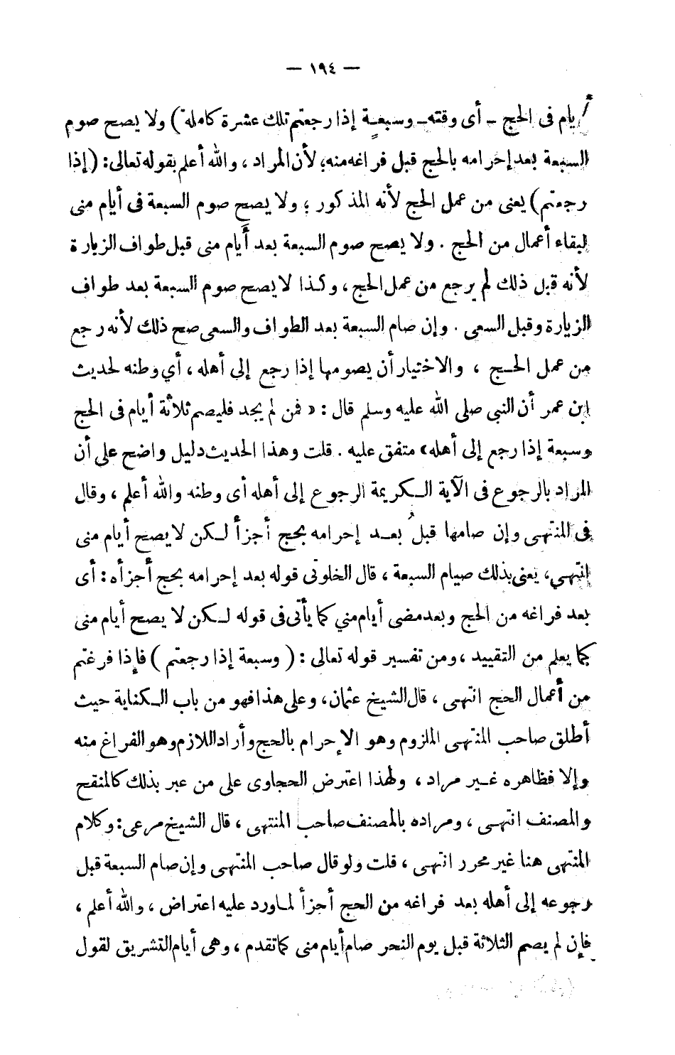 ولا يصح صوم السبعة بعد إحرامه بالحج قبل فراغه منه، لأن المراد، والله أعلم بقوله تعالى: (إذا رجعتم) يعني من عمل الحج لأنه المذكور، ولا يصح صوم السبعة في أيام منى لبقاء أعمال من الحج. ولا يصح صوم السبعة بعد أيام منى قبل طواف الزيارة لأنه قبل ذلك لم يرجع من عمل الحج، وكذا لا يصح صوم السبعة بعد طواف الزيارة وقبل السعي. وإن صام السبعة بعد الطواف والسعي صح ذلك لأنه رجع من عمل الحج، والاختيار أن يصومها إذا رجع إلى أهله، أي وطنه لحديث ابن عمر أن النبي صلى الله عليه وسلم قال: (فمن لم يجد فليصم ثلاثة أيام في الحج وسبعة إذا رجع إلى أهله) . متفق عليه. قلت وهذا الحديث دليل واضح على أن المراد بالرجوع في الآية الكريمة الرجوع إلى أهله أي وطنه والله أعلم. وقال في المنتهى وإن صامها قبل بعد إحرامه بحج أجزأ لكن لا يصح أيام منى انتهى، يعني بذلك صيام السبعة.