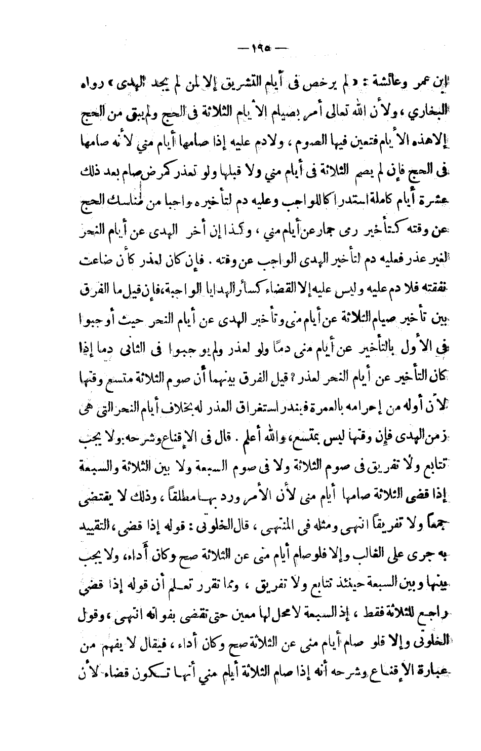 ابن عمر وعائشة: (لم يرخص في أيام التشريق إلا لمن لم يجد الهدي) . رواه البخاري، ولأن الله تعالى أمر بصيام الأيام الثلاثة في الحج ولم يبق من الحج إلا هذه الأيام فتعين فيها الصوم، ولا دم عليه إذا صامها أيام منى لأنه صامها في الحج فإن لم يصم الثلاثة في أيام منى ولا قبلها ولو لعذر كمرض صام بعد ذلك عشرة أيام كاملة استدراكاً للواجب وعليه دم لتأخيره واجباً من مناسك الحج عن وقته كتأخير رمي جمار عن أيام منى، وكذا إن أخر الهدي عن أيام النحر لغير عذر فعليه دم لتأخير الهدي الواجب عن وقته، فإن كان لعذر كأن ضاعت نفقته فلا دم عليه وليس عليه إلا القضاء كسائر الهدايا الواجبة، فإن قيل ما الفرق بين تأخير صيام الثلاثة عن أيام منى وتأخير الهدي عن أيام النحر حيث أوجبوا في الأول بالتأخير عن أيام منى دماً ولو لعذر ولم يوجبوا في الثاني دما إذا كان التأخير عن أيام النحر لعذر؟ قيل الفرق بينهما أن صوم الثلاثة متسع وقتها لأن أوله من إحرامه بالعمرة فيندر استغراق العذر له بخلاف أيام النحر التي هي زمن الهدي فإن وقتها ليس بمتسع، والله أعلم.