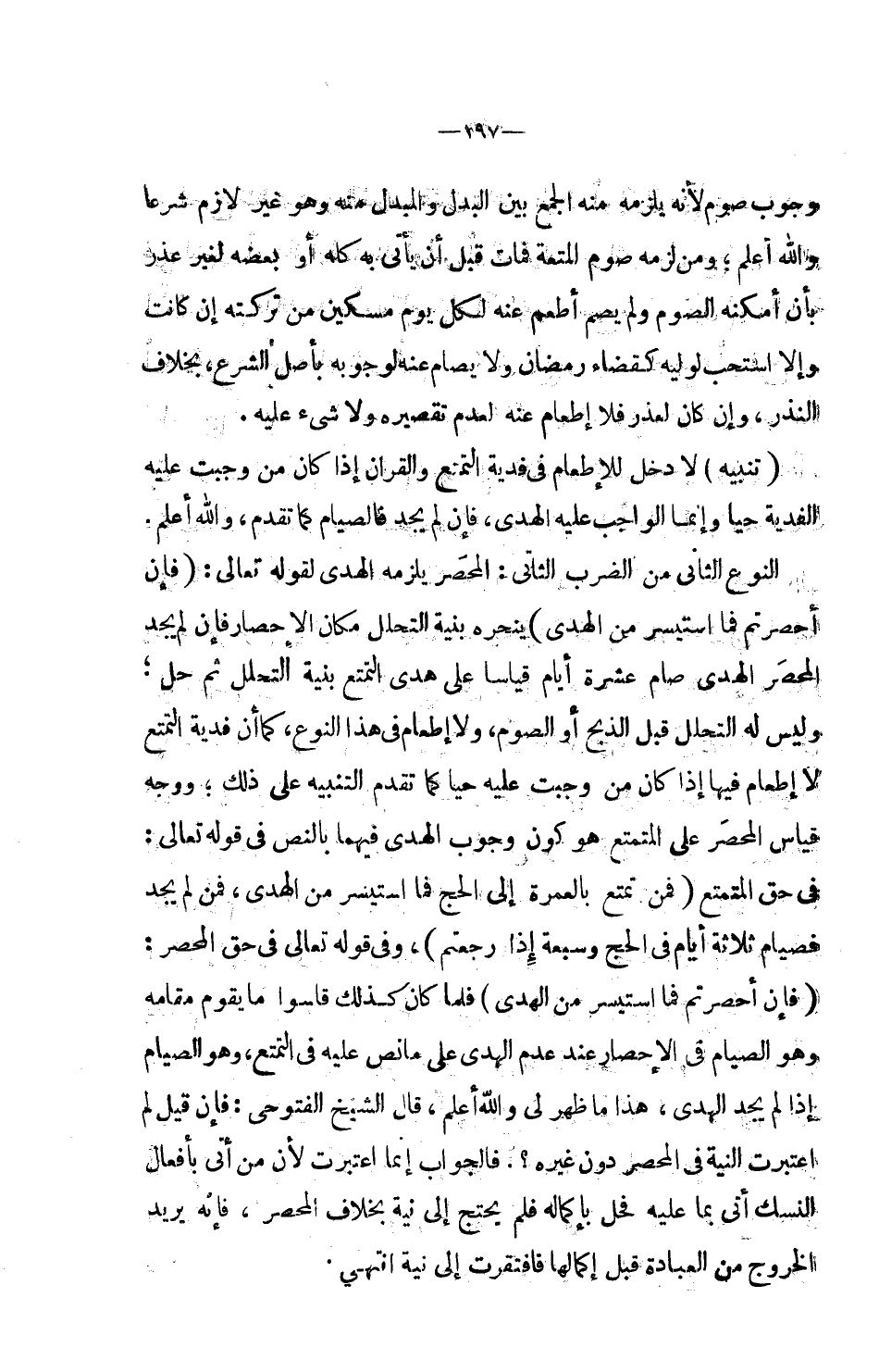 النوع الثاني من الضرب الثاني: المحصر يلزمه الهدي لقوله تعالى: (فإذا أحصرتم فما استيسر من الهدي) ينحره بنية التحلل مكان الإحصار فإن لم يجد المحصر الهدي صام عشرة أيام قياساً على هدي التمتع بنية التحلل ثم حل، وليس له التحلل قبل الذبح أو الصوم، ولا إطعام في هذا النوع كما أن فدية التمتع لا إطعام فيها إذا كان من وجبت عليه حيا كما تقدم التنبيه على ذلك، ووجه قياس المحصر على المتمتع هو كون وجوب الهدي فيهما بالنص في قوله تعالى في حق المتمتع: (فمن تمتع بالعمرة إلى الحج فما استيسر من الهدي فمن لم يجد فصيام ثلاثة أيام في الحج وسبعة إذا رجعتم) . وفي قوله تعالى في حق المحصر: (فإن أُحصر تم فما استيسر من الهدي) .