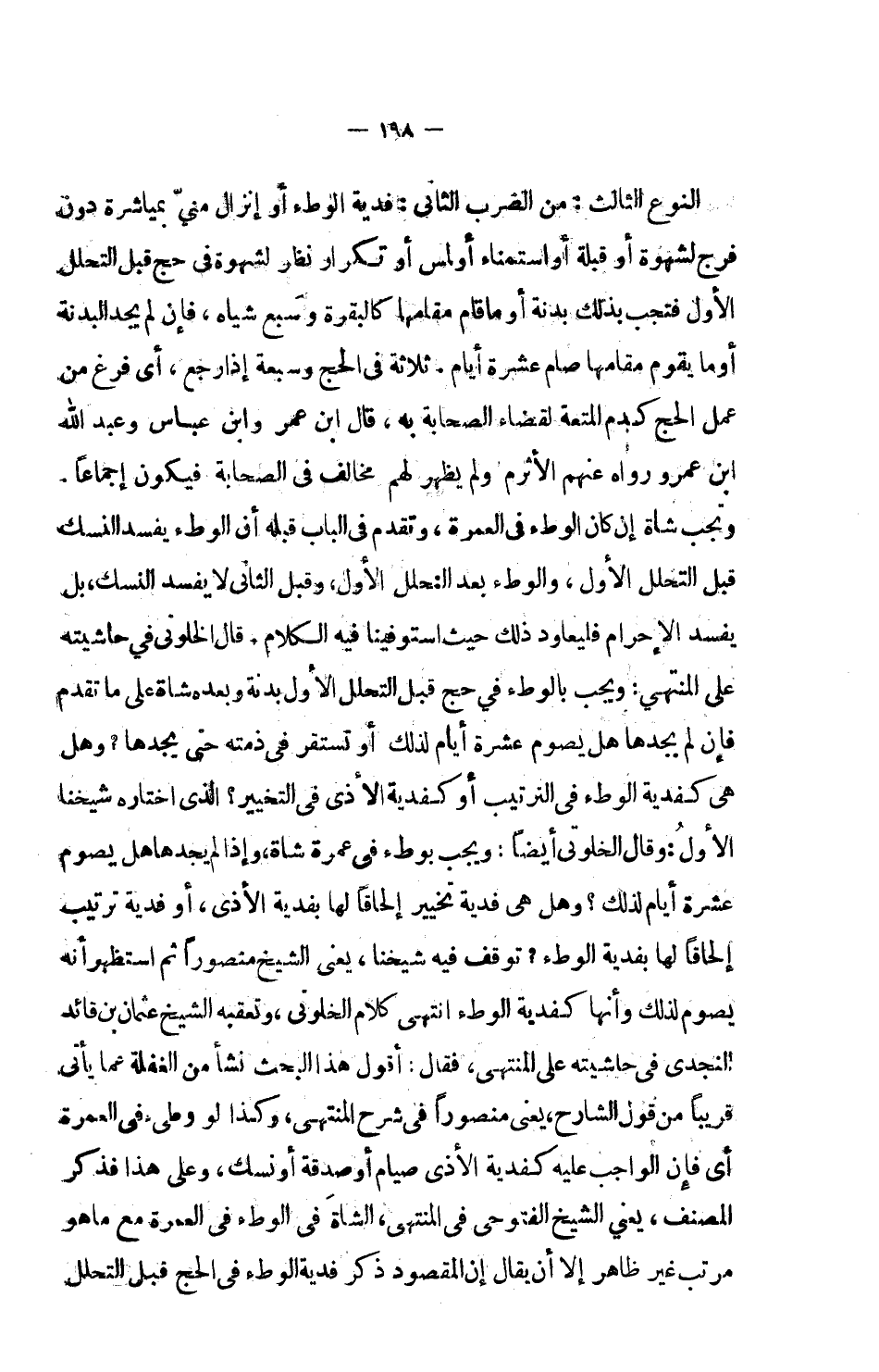 قال الخلوتي في حاشته على المنتهى: ويجب بالوطء في حج قبل التحلل الأول بدنة وبعده شاة على ما تقدم فإن لم يجدها هل يصوم عشرة أيام لذلك أو تستقر في ذمته حتى يجدها؟ وهل هي كفدية الوطء في الترتيب أو كفدية الأذى في التخيير؟ الذي اختاره شيخنا الأول: وقال الخلوتي أيضا: ويجب بوطء في عمرة شاة، وإذا لم يجدها هل يصوم عشرة أيام لذلك؟ وهل هي فدية تخيير إلحاقاً لها بفدية الأذى، أو فدية ترتيب إلحاقاً لها بفدية الوطء؟ توقف فيه شيخنا، يعني الشيخ منصور ثم استظهر أنه يصوم لذلك وأنها كفيدة الوطء انتهى كلام الخلوتي، وتعقبه الشيخ عثمان بن قائد النجدي في حاشيته على المنتهى، فقال: أقول هذا البحث نشأ من الغفلة مما يأتي قريباً من قول الشارح، يعني منصوراً في شرح المنتىهى، وكذلك لو وطيء في العمرة أي فإن الواجب عليه كفدية الأذى صيام أو صدقة أو نسك، وعلى هذا فذكر المصنف، يعني الشيخ الفتوحي في المنتهى، الشاة في الوطء في العمرة مع ما هو مرتب غير ظاهر إلا أن يقال إن المقصود ذكر فدية الوطء في الحج قبل التحلل
