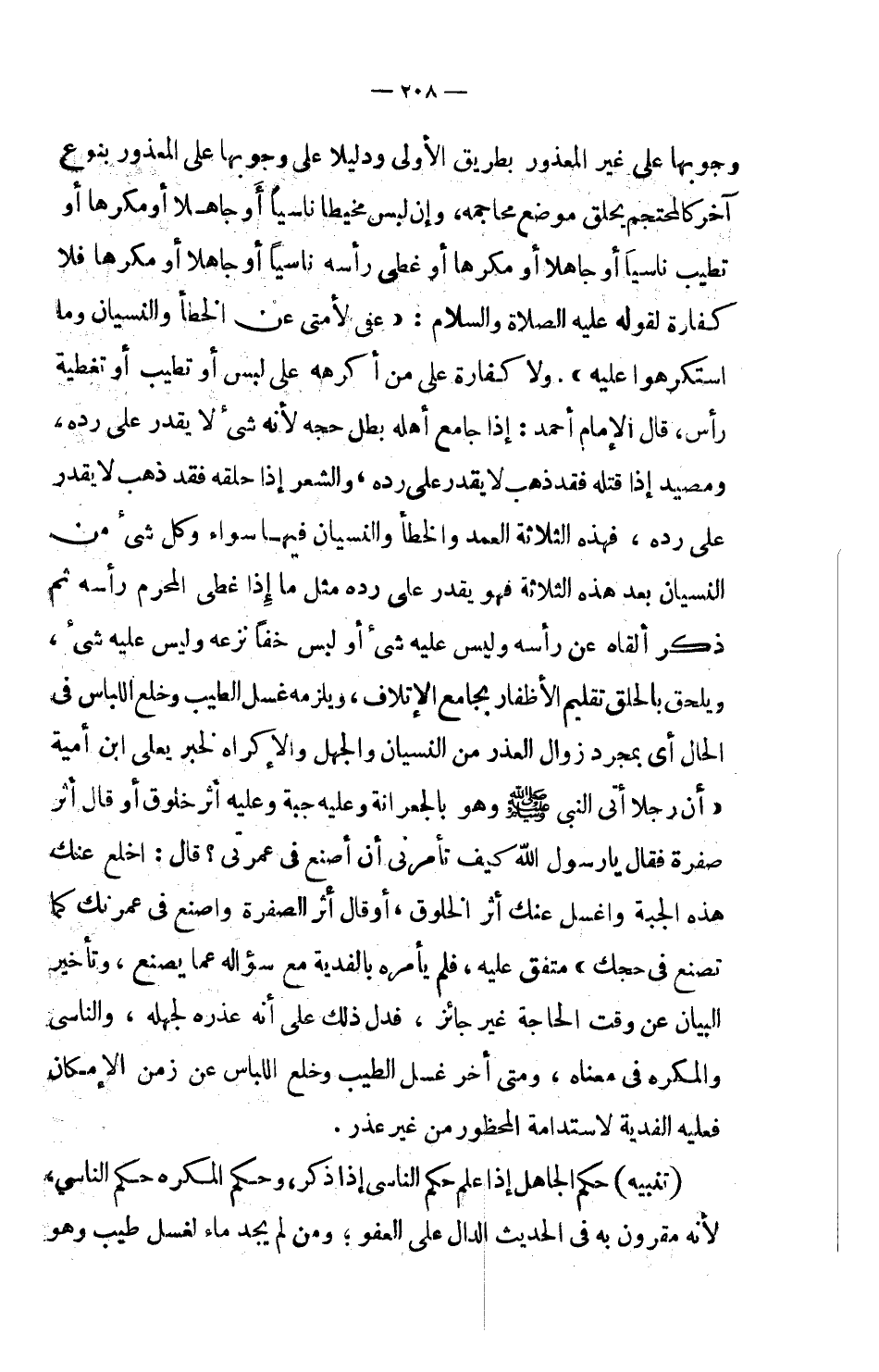 وجوبها على غير المعذور بطريق الأولى ودليلاً على وجوبها على المعذور بنوع آخر كالمحتجم بحلق موضع محاجمه، وإن لبس مخيطاً ناسياً أو جاهلاً أو مكرها أو تطيب ناسياً أو جاهلاً أو مكرها أو غطى رأسه ناسياً أو جاهلاً أو مكرها فلا كفارة لقوله عليه الصلاة والسلام: (عفي لأمتي عن الخطأ والنسيان وما استكرهوا عليه) . ولا كفارة على من أكرهه على لبس أو تطيب أو تغطية رأس، قال الإمام أحمد: إذا جامع أهله بطل حجه لأنه شيء لا يقدر على رده، ومصيد إذا قتله فقد ذهب لا يقدر على رده، والشعر إذا حلقه فقد ذهب لا يقدر على رده، فهذه الثلاثة العمد والخطأ والنسيان فيها سواء وكل شيء من النسيان بعد هذه الثلاثة فهو يقدر على رده مثل ما إذا غطى المحرم رأسه ثم ذكر ألقاه عن رأسه وليس عليه شيء أو لبس خفاً نزعه وليس عليه شيء، ويلحق بالحلق تقليم الأظفار بجامع الإتلاف، ويلزمه غسل الطيب وخلع اللباس في الحال أي بمجرد زوال العذر من النسيان والجهل والإكراه لخبر يعلي بن أمية (أن رجلاً أتى النبي صلى الله عليه وسلم وهو بالجعرانة وعليه جبة وعليه أثر خلوق أو قال أثر صفرة فقال يا رسول الله كيف تأمرني أن أصنع في عمرتي؟ قال: اخلع عنك هذه الجبة واغسل عنك أثر الخلوق، أو قال أثر الصفرة واصنع في عمرتك كما تصنع في حجك) . متفق عليه، فلم يأمره بالفدية مع سؤاله عما يصنع، وتأخير البيان عن وقت الحاجة غير جائز، فدل ذلك على أنه عذره لجهله، والناسي والمكره في معناه، ومتى أخر غسل الطيب وخلع اللباس عن زمن الإمكان فعليه الفدية لاستدامة المحظور من غير عذر.