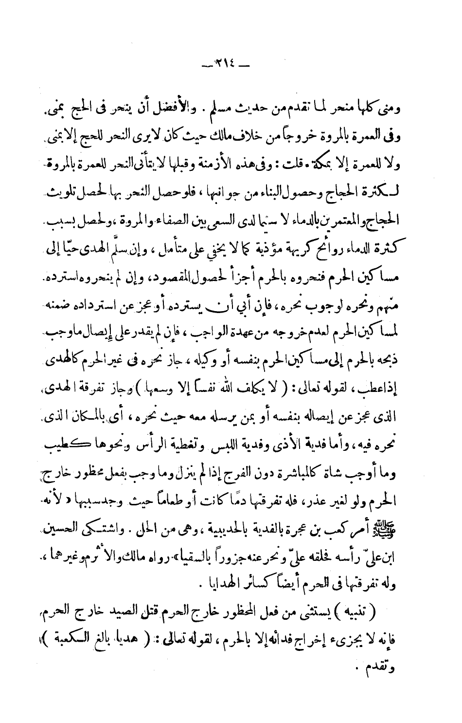 ومنى كلها منحر لما تقدم من حديث مسلم. والأفضل أن ينحر في الحج بمنى وفي العمرة بالمروة خروجاً من خلاف مالك حيث كان لا يرى النحر للحج إلا بمنى ولا للعمرة إلا بمكة.
