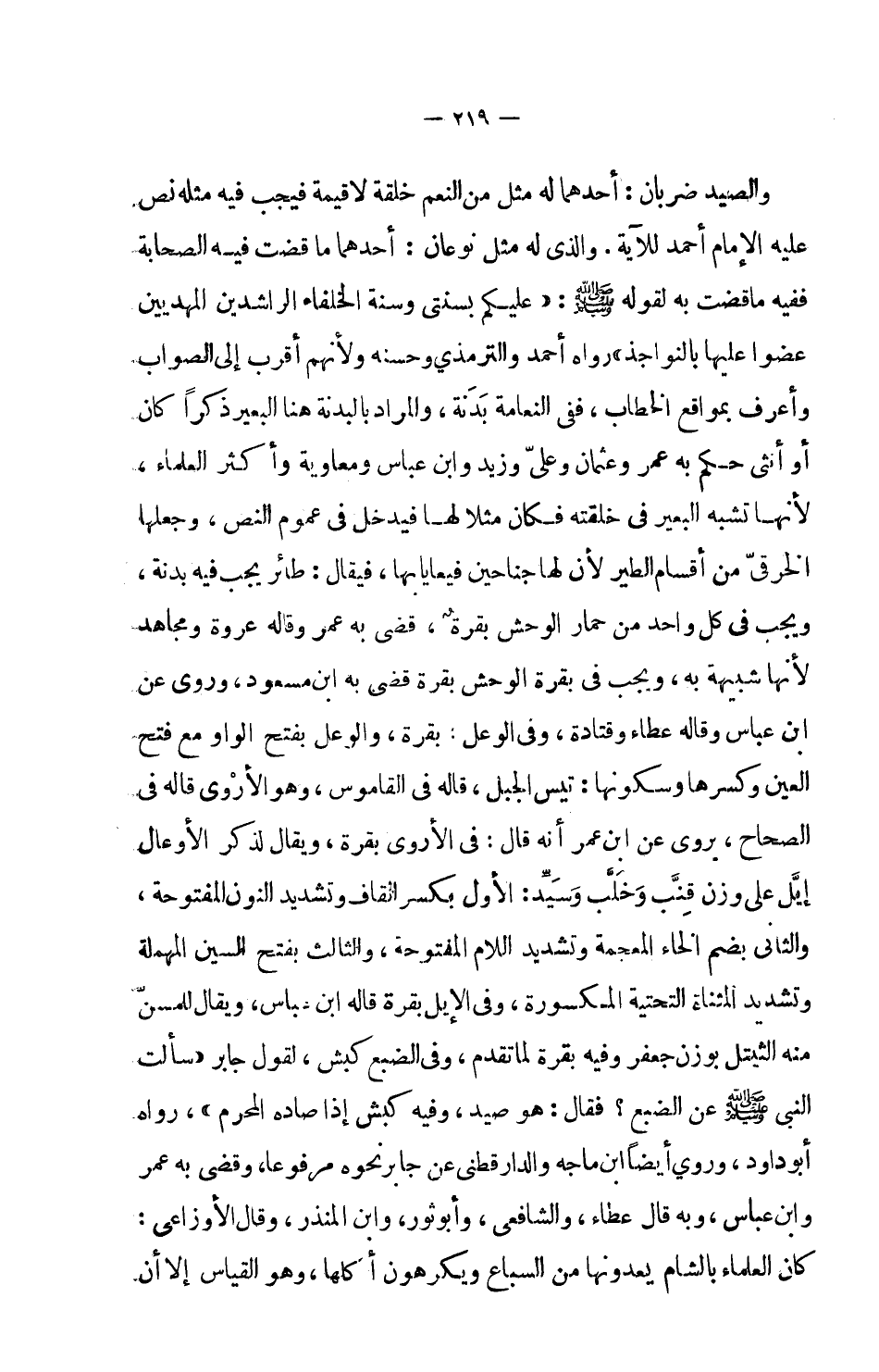 والصيد ضربان: أحدهما له مثل من النعم خلقة لا قيمة فيجب فيه مثله نص عليه الإمام أحمد للآية، والذي له مثل نوعان: أحدهما ما قضت فيه الصحابة ففيه ما قضت به لقوله صلى الله عليه وسلم: (عليكم بسنتي وسنة الخلفاء الراشدين المهديين عضوا عليها بالنواجذ) رواه أحمد والترمذي وحسنه ولأنهم أقرب إلى الصواب وأعرف بمواقع الخطاب، ففي النعامة بدنة، والمراد بالبدنة هنا البعير ذكراً كان أو أنثى حكم به عمر وعثمان وعلي وزيد وابن عباس ومعاوية وأكثر العلماء، لأنها تشبه البعير في خلقته فكان مثلاً لها فيدخل في عموم النص، وجعلها الخرقي من أقسام الطير لأن لها جناحين فيعايابها، فيقال: طائر يج فيه بدنة، ويجب في كل واحد من حمار الوحش بقرة، قضى به عمر وقاله عروة ومجاهد لأنه شبيهة به، ويجب في بقرة الوحش بقرة قضى به ابن مسعود، وروى عن ابن عباس وقاله عطاء وقتادة، وفي الوعل: بقرة، والوعل بفتح الواو مع فتح العين وكسرها وسكونها: تيس الجبل، قاله في القاموس، وهو الأروى قاله في الصحاح، يروى عن ابن عمر أنه قال: في الأروى بقرة، ويقال لذكر الأوعال إيَّل على وزن قِنَّب وخُلَّب وسيِّد: الأول بكسر القاف وتشديد النون المفتوحة، والثاني بضم الخاء المعجمة وتشديد اللام المفتوحة، والثالث بفتح السين المهملة وتشديد المثناة التحتية المكسورة، وفي الإبل بقرة قاله ابن عباس ويقال للمسن منه الثيتل بوزن جعفر وفيه بقرة لما تقدم، وفي الضبع كبش، لقول جابر (سألت النبي صلى الله عليه وسلم عن الضبع؟ فقال: هو صيد، وفيه كبش إذا صاده المحرم) . رواه أبو داود، وروى أيضاً ابن ماجة والدارقطني عن جابر نحوه مرفوعاً، وقضي به عمر وابن عباس، وبه قال عطاء، والشافعين وأبو ثور، وابن المنذر، وقال الأوزاعي: كان العلماء بالشام يعدونها من السباع ويكرهون أكلها، وهو القياس إلا أن
