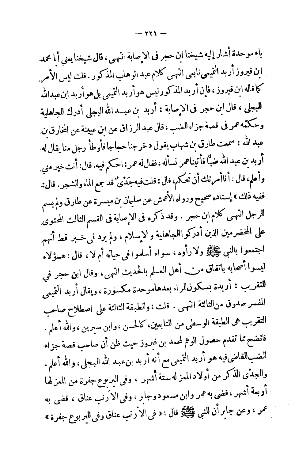 قلت ليس الأمر كما قاله ابن فيروز، فإن أربد المذكور ليس هو أربد التميمي بل هو أربد بن عبد الله البجلي، قال ابن حجر في الإصابة: أربد بن عبد الله البجلي أدرك الجاهلية وحكَّمه عمر في قصة جزاء الضب، قال عبد الرزاق عن ابن عيينة عن المخارق بن عبد الله: سمعت طارق بن شهاب يقول: (خرجنا حجاجاً فأوطأ رجل منا يقال له أربد بن عبد الله ضبا فأتينا عمر نسأله، فقال له عمر: احكم فيه. قال: أنت خير مني وأعلم، قال: أنا أمرتك أن تحكم، قال: قلت فيه جديٌ قد جمع الماء والشجر. قال: ففيه ذلك) إسناده صحيح ورواه الأعمش عن سليمان بن ميسرة عن طارق ولم يسم الرجل انتهى كلام ابن حجر. وقد ذكره في الإصابة في القسم الثالث المحتوى على المخضرمين الذين أدركوا الجاهلية والإسلام، ولم يرد في خبر قط أنهم اجتمعوا بالنبي صلى الله عليه وسلم ولا رأوه، سواء أسلموا في حياته أم لا، قال: هؤلاء ليسوا أصحابه باتفاق من أهل العلم بالحديث انتهى. وقال ابن حجر في التقريب: أربدة يسكون الراء بعدها موحدة مكسورة، ويقال أربد التميميم المفسر صدوق من الثالثة انتهى. قلت: والطبقة الثالثة على اصطلاح صاحب التقريب هي الطبقة الوسطى من التابعين، كالحسن، وابن سيرين، والله أعلم.