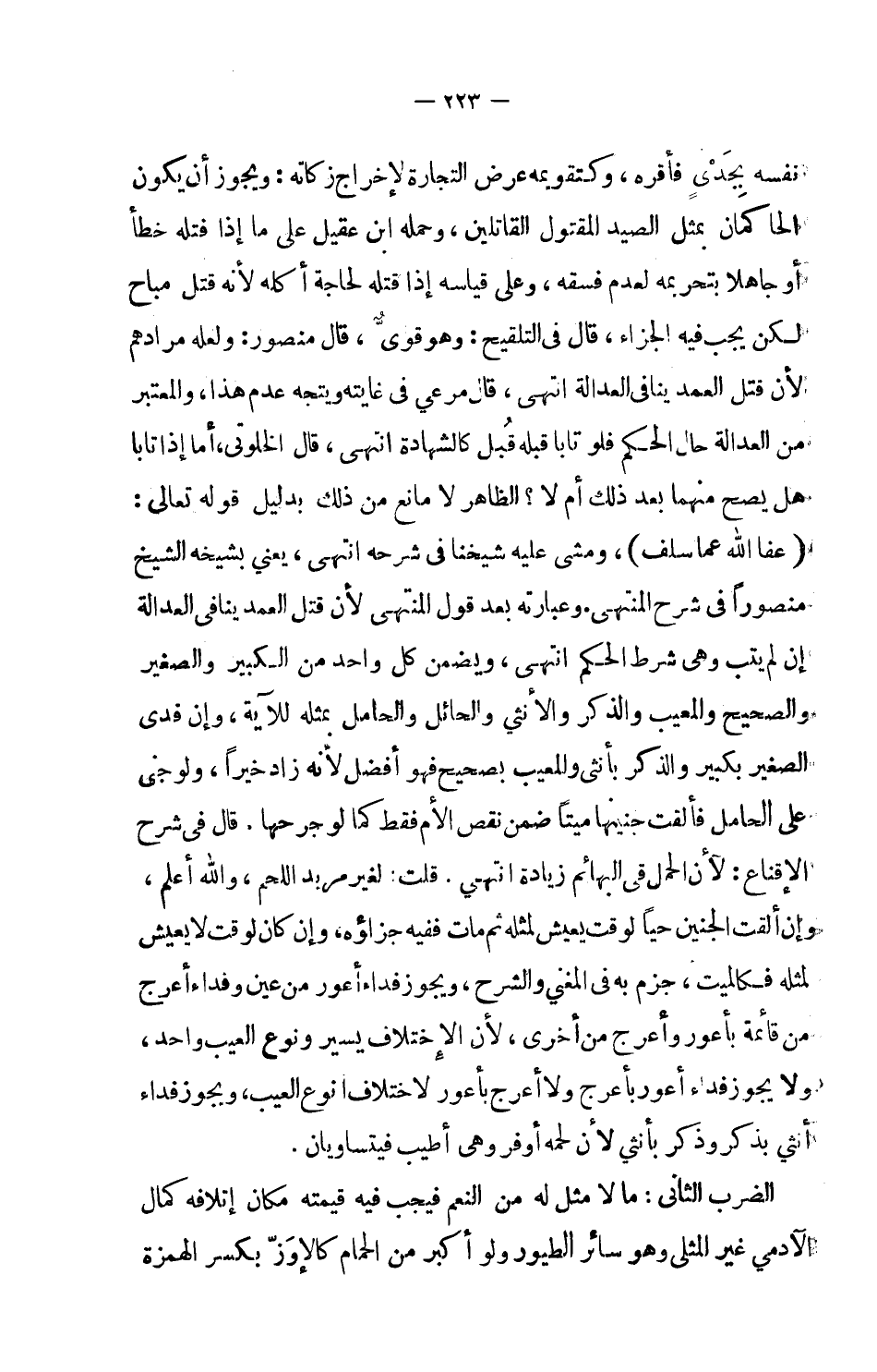 نفسه بجدي فأقره، وكتقويمه عرض التجارة لإخراج زكاته: ويجوز أن يكون الحاكمان بمثل الصيد المقتول القاتلين، وحمله ابن عقيل على ما إذا قتله خطأ أو جاهلاً بتريمه لعدم فسقه، وعلى قياسه إذا قتله لحاجة أكل لأنه قتل مباح لكن يجب فيه الجزاء.