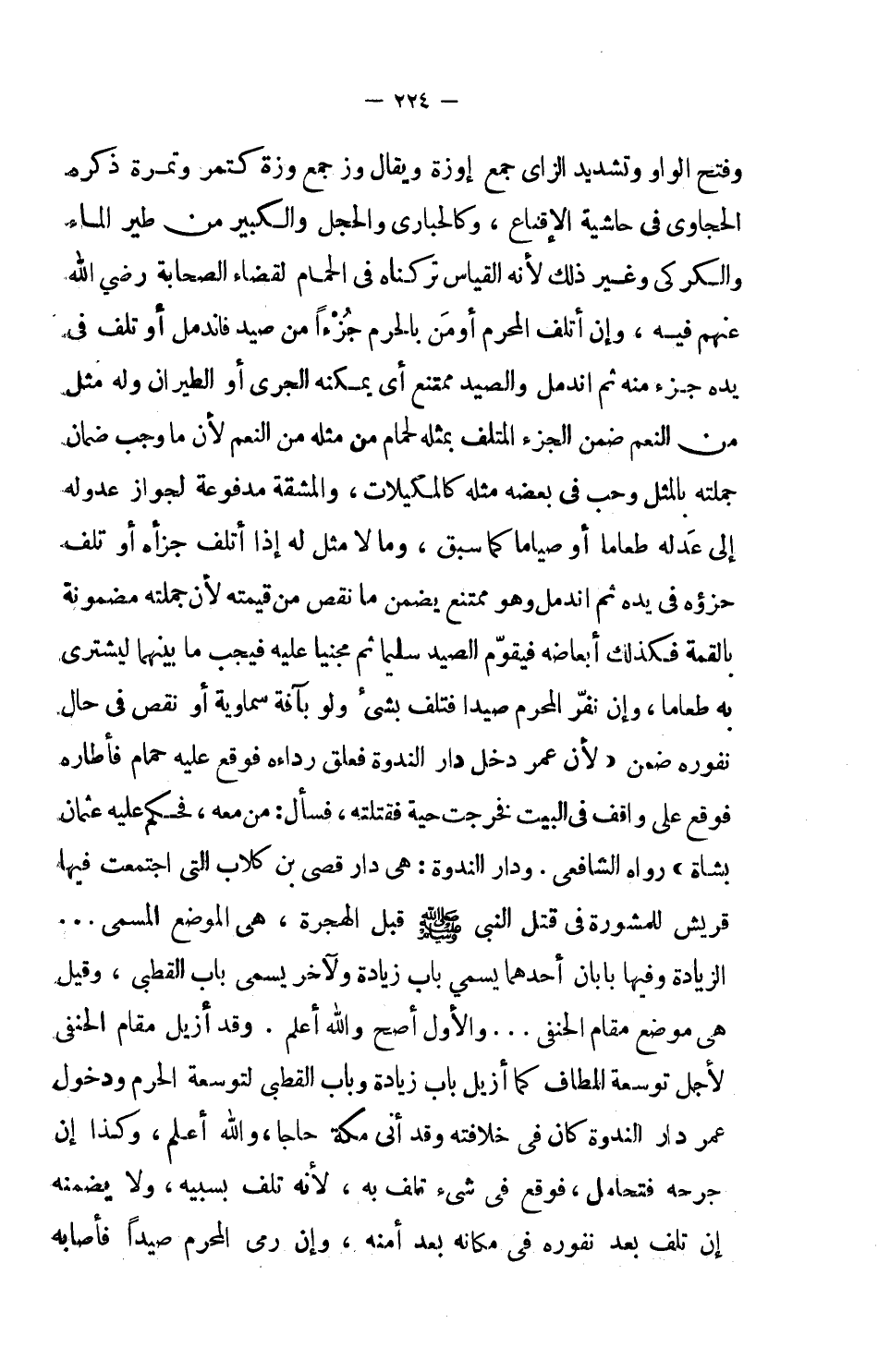 وقد أزيل مقام الحنفي لأجل توسعة المطاف كما أزيل باب زيادة وباب القطبي لتوسعة الحرم ودخول عمر دار الندوة كان في خلافته وقد أتى مكة حاجاً، والله أعلم، وكذا إن جرحه فتحامل، فوقع في شي تلف به، لأنه تلف بسببه، ولا يضمنه إن تلف بعد نفوره في مكانه بعد أمنه، وإن رمى المحرم صيداً فأصابه