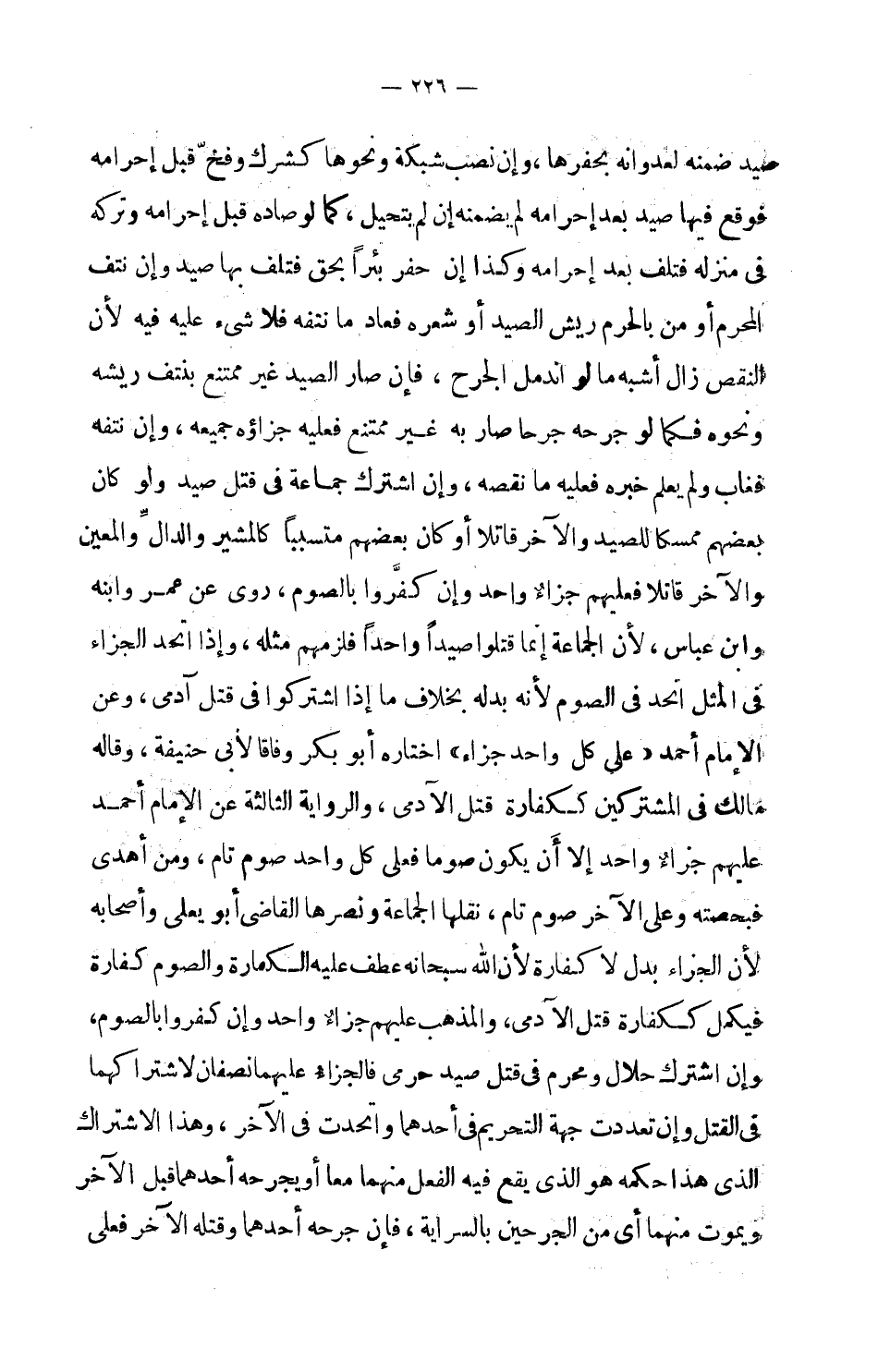 صيد ضمنه لعدوانه بحفرها، وإن نصب شبكة ونحوها كشَرك وفخ قبل إحرامه فوقع فيها صيد بعد إحرامه لم يضمنه إن لم يتحيل، كما لو صاده قبل إحرامه وتركه في منزله فتلف بعد إحرامه وكذا إن حفر بئراً بحق فتلف بها صيد وأن نتف المحرم أو من بالحرم ريش الصيد أو شعره فعاد ما نتفه فلا شيء عليه فيه لأن النقص زال أشبه ما لو اندمل الجرح، فإن صار الصيد غير ممتنع بنتف ريشه ونحوه فكما لو جرحه جرحاً صار به غير ممتنع فعليه جزاؤه جميعه، وإن نتفه فغاب ولم يعلم خبره فعليه ما نقصه، وإن اشترك جماعة في قتل صيد ولو كان بعضهم ممسكاً للصيد والآخر قاتلاً أو كان عضهم متسبباً كالمشير والدال والمعين والآخر قاتلاً فعليهم جزءاٌ واحد وإن كفروا بالصوم، روي عن عمر وابنه وابن عباس، لأن الجماعة إنما قتلوا صيداً واحداً فلزمهم مثله، وإذا اتحد الجزاء في المثل اتحد في الصوم لأنه بدله بخلاف ما إذا اشتركوا في قتل آدمي، وعن الإمام أحمد (على كل واحد جزاء) اختاره أبو بكر وفاقاً لأبي حنيفة، وقاله مالك في المشتركين ككفارة قتل الآدمي، والرواية الثالثة عن الإمام أحمد عليهم جزاءٌ واحد إلا أن يكون صوماً فعلى كل واحد صوم تام، ومن أهدى فبحصته وعلى الآخر صوم تام، نقلها الجماعة ونصرها القاضي أبو يعلى وأصحابه لأن الجزاء بدل لا كفارة لأن الله سبحانه عطف عليه الكفارة والصوم كفارة فيكمل ككفارة قتل الآدمي، والمذهب عليهم جزاء واحد وإن كفروا بالصوم، وإن اشترك حلال ومحرم في قتل صيد حرمى فالجزاء عليهما نصفان لاشتراكهما في التقل وإن تعددت جهة التحريم في أحدهما واتحدت في الآخر، وهذا الاشتراك الذي هذا حكمه هو الذي يقع فيه الفعل منهما معاً أو يجرحه أحدهما قبل الآخر ويموت منهما أي