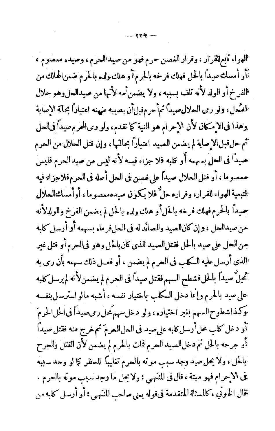 الهواء تابع للقرار، وقرار الغصن حرم فهو من صيد الحرم، وصيده معصوم، أو أمسك صيداً بالحل فهلك فرخه بالحرم أو هلك ولده بالحرم ضمن الهالك من الفرخ أو الولد لأنه تلف بسببه، ولا يضمن أمه لأنها من صيد الحل وهو حلال للمحل، ولو رمى الحلال صيداً ثم أحرم قبل أن يصيبه ضمنه اعتباراً بحالة الإصابة وهذا في الإمكان لأن الأحرام هو النية كما تقدم، ولو رمى المحرم صيداً في الحل ثم حل قبل الإصابة لم يضمن الصيد اعتباراً بحالتها، وإن قتل الحلال من الحرم صيداً في الحل بسهمه أو كلبه فلا جزاء فيه لأنه ليس من صيد الحرم فليس معصوما، أو قتل الحلال صيداً على غصن في الحل أصل في الحرم فلا جزاء فيه لتبعية الهواء للقرار، وقراره حل فلا يكون صيده معصوماً، أو أمسك الحلال صيداً بالحرم فهلك فرخه بالحل أو هلك ولده بالحل لم يضمن الفرخ والولد لأنه من صيد الحل، وإن كان الصيد والصائد له في الحل فرماه بسهمه أو أرسل كلبه في الحل على صيد بالحل فقتل الصيد الذي كان بالحل وهو في الحرم أو قتل غير الذي أرسل عليه الكلب في الحرم لم يضمن، أو فعل ذلك سهمه بأن رمى به محل صيداً بالحل فشطح السهم فقتل صيداً في الحرم لم يضمن لأنه لم يرسل كلبه على صيد بالحرم وإنما دخل الكلب باختيار نفسه، أشبه ما لو استرسل بنفسه وكذا شطوح السهم بغير اختياره، ولو دخل سهم محل رمى صيداً في الحل الحرم أو دخل كلب محل أرسل كلبه على صيد في الحل الحرم ثم خرج منه فقتل صيداً أو جرحه بالحل ثم دخل