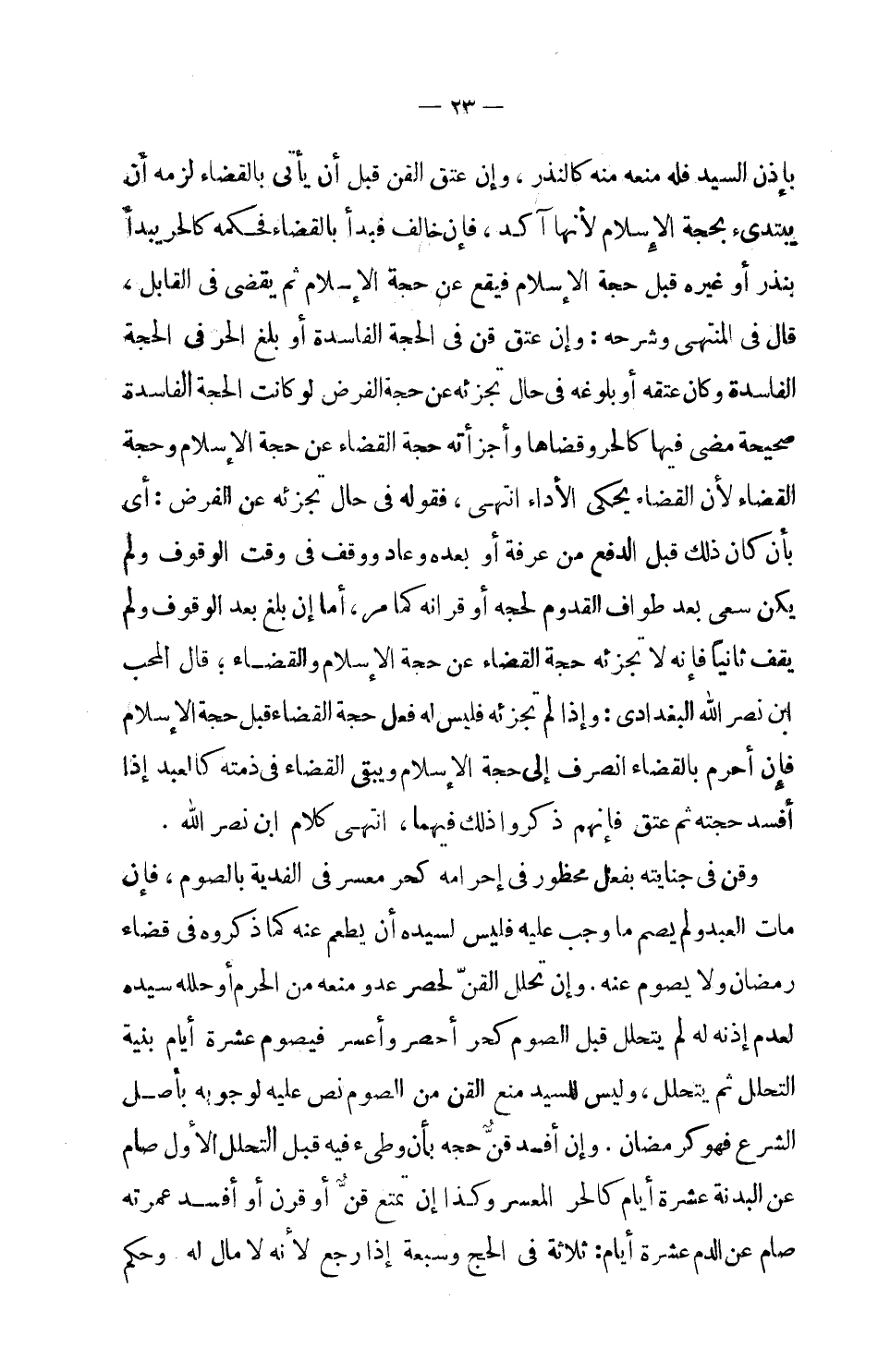 بإذن السيد فله منعه منه كالنذر، وإن عتق القن قبل أن يأتي بالقضاء لزمه أن يبتدئ بحجة الإسلام لأنها آكد، فإن خالف فبدأ بالقضاء فحكمه كالحر يبدأ بنذر أو غيره قبل حجة الإسلام فيقع عن حجة الإسلام ثم يقضي في القابل، قال في المنتهى وشرحه: وإن عتق قن في الحجة الفاسدة أو بلغ الحر في الحجة الفاسدة وكان عتقه أو بلوغه في حال تجزئه عن حجة الفرض لو كانت الحجة الفاسدة صحيحة مضى فيها كالحر وقضاها وأجزأته حجة القضاء عن حجة الإسلام وحجة القضاء لأن القضاء يحكي الأداء انتهى. فقوله في حال تجزئه عن الفرض: أي بأن كان ذلك قبل الدفع من عرفة أو بعده وعاد ووقف في وقت الوقوف ولم يكن سعى بعد طواف القدوم لحجه أو قرانه كما مر، أما إن بلغ بعد الوقوف ولم يقف ثانياً فإنه لا تجزئه حجة القضاء عن حجة الإسلام والقضاء؛ قال المحب بن نصر الله البغدادي: وإذا لم تجزئه فليس له فعل حجة القضاء قبل حجة الإسلام فإن أحرم بالقضاء انصرف إلى حجة الإسلام ويبقى القضاء في ذمته كالعبد إذا أفسد حجته ثم عتق فإنهم ذكروا ذلك فيهما، انتهى كلام ابن نصر الله.