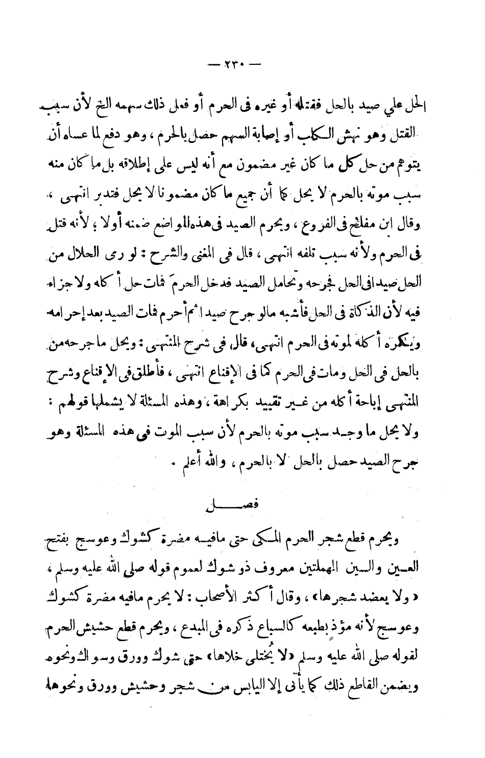 ويحرم قطع شجر الحرم المكي حتى ما فيه مضرة كشوك وعوسج بفتح العين والسين المهملتين معروف ذو شوك لعموم قوله صلى الله عليه وسلم (ولا يعضد شجرها) ، وقال أكثر الأصحاب: لا يحرم ما فيه مضرة كشوك وعوسج لأنه مؤذٍ بطبعه كالسياع ذكره في المبدع، ويحرم قطع حشيش الحرم لقوله صلى الله عليه وسلم (لا يختلى خلاها) حتى شوك وورق وسواك ونحوه ويضمن القاطع ذلك كما يأتي إلا اليابس من شجر وحشيش وورق ونحوها