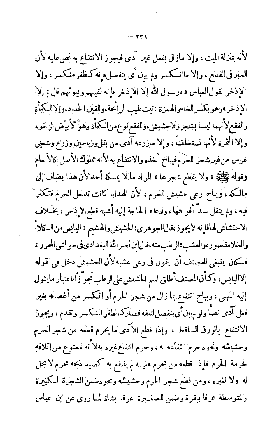 لأنه بمنزلة الميت، وإلا ما زال بفعل غير آدمي فيجوز الانتفاع به نص عليه لأن الخبر في القطع وإلا ما انكسر ومل يبن أي ينفصل فإنه كظفر منكسر، وإلا الإذخر لقول العباس: (يا رسول الله إلا الإذخر فإنه لقينهم وبيوتهم قال: إلا الإذخر) وهو بكسر الخاء والهمزة: نبت طيب الرائحة، والقين الحداد، وإلا الكمأة والفقع لأنهما ليسا بشجر ولا حشيس، والفقع نوع من الكمأة وهو الأبيض الرخو، وإلا الثمرة لأنها تستخلف، وإلا ما زرعه آدمي من بقل ورياحين وزرع وشجر غرس من غير شجر الحرم فيباح أخذه والانتفاع به لأنه مملوك الأصل كالأنعام وقوله صلى الله عليه وسلم: (ولا يقطع شجرها) المراد ما لا يملكه أحد لأن هذا يضاف إلى مالكه، ويباح رعي حشيش الحرم، لأن الهدايا كانت تدخل الحرم فتكثر فيه، ولم ينقل سد أفواهها، ولدعاء الحاجة إليه أشبه قطع الإذخر، بخلاف الاحتشاش لها فإنه لا يجوز.