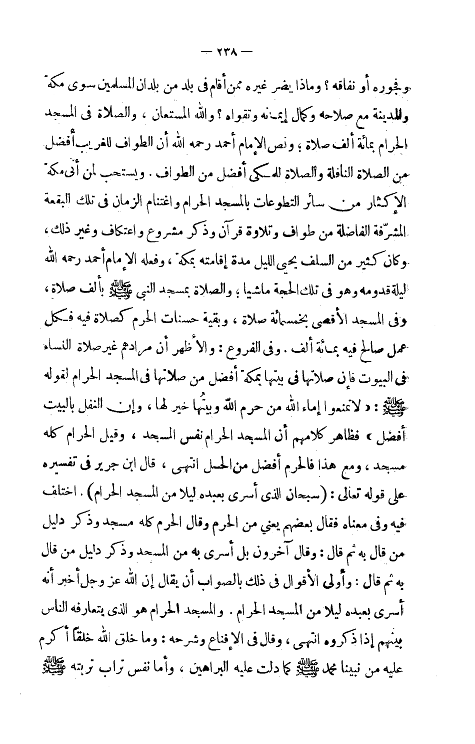 وفي الفروع: والأظهر أن مرادهم غير صلاة النساء في البيوت فإن صلاتها في بيتها بمكة أفضل من صلاتها في المسجد الحرام لقوله صلى الله عليه وسلم: (لا تمنعوا إماء الله من حرم الله وبيتها خير لها، وإن النفل بالبيت أفضل) فظاهر كلامهم أن المسجد الحرام نفس المسجد، وقيل الحرام كله مسجد، ومع هذا فالحرم أفضل من الحل انتهى، قال ابن جرير في تفسيره على قوله تعالى: (سبحان الذي أسرى بعبده ليلا من المسجد الحرام) . اختلف فيه وفي معناه فقال بعضهم يعني من الحرم كله مسجد وذكر دليل من قال به ثم قال: وقال آخرون بل أسرى به من المسجد وذكر دليل من قال به ثم قال: وأولى الأقوال في ذلك بالصواب أن يقال إن الله عز وجل أخبر أنه أسرى بعبده ليلاً من المسجد الحرام. والمسجد الحرام هو الذي يتعارفه الناس بينهم إذا ذكروه انتهى.