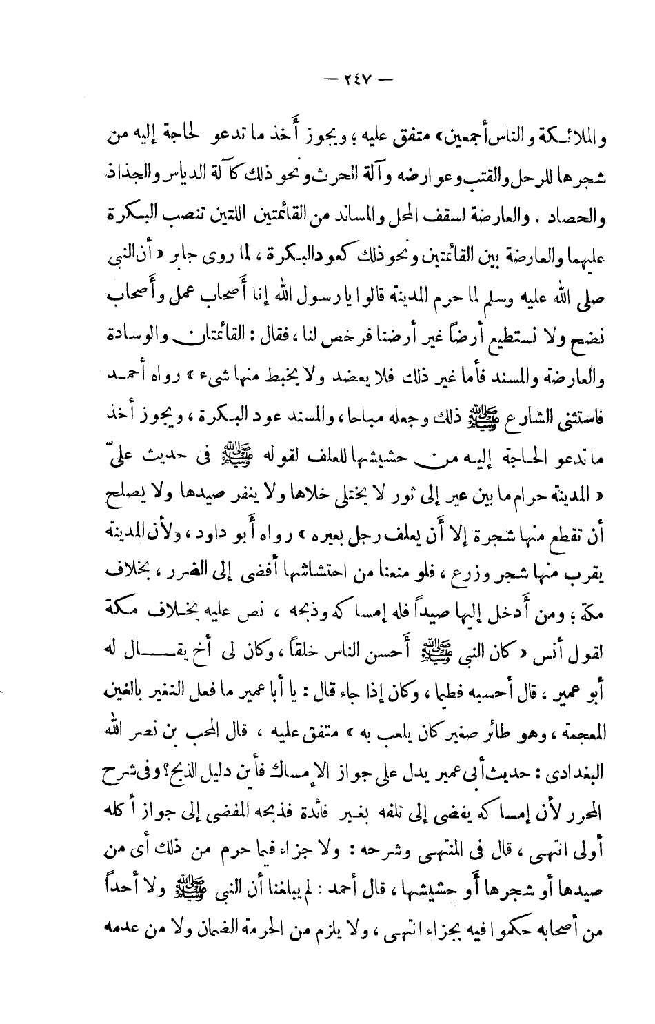 والملائكة والناس أجمعين) . متفق عليه. ويجوز أخذ ما تدعو لحاجة إليه من شجرها للرحل والقتب وعوارضه وآلة الحرث ونحو ذلك كآلة الدياس والجذاذ والحصاد. والعارضة لسقف المحمل والمساند من القائمتين اللتين تنصب البكرة عليهما والعارضة بين القائمتين ونحو ذلك كعود البكرة، لما روى جابر (أن النبي صلى الله عليه وسلم لما حرم المدينة قالوا يا رسول الله إنا أصحاب عمل وأصحاب نضج ولا نستطيع أرضاً غير أرضنا فرخص لنا، فقال: القائمتان والوسادة والعارضة والمسند فأما غير ذلك فلا يعضد ولا يخبط منها شيء) . رواه أحمد فاستثنى الشارع صلى الله عليه وسلم ذلك وجعله مباحاً، والمسند عود البكرة، ويجوز أخذ ما تدعو الحاجة إليه من حشيشها للعلف لقوله صلى الله عليه وسلم في حديث علي (المدينة حرام ما بين عير إلى ثور لا يختلى خلالها ولا ينفر صيدها ولا يصلح أن تقطع منها شجرة إلا أن يعلف رجل بعيره) .