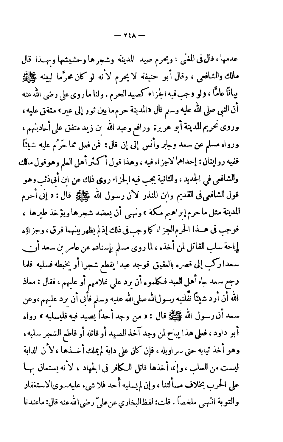 متفق عليه، وروى تحريم المدينة أبو هريرة ورافع وعبد الله بن زيد متفق على أحاديثهم، ورواه مسلم عن سعد وجابر وأنس إلى إن قال: فمن فعل مما حرُم عليه شيئاً ففيه روايتان: إحداهما لأجزاء فيه، وهذا قول أكثر أهل العلم وهو قول مالك والشافعي في الجديد، والثانية يجب فيه الجزاء روى ذلك عن ابن أبي ذئب وهو قول الشافعي في القديم وابن المنذر لأن رسول الله صلى الله عليه وسلم قال: (إني أحرم المدينة مثل ما حرم إبراهيم مكة) ونهى أن يعضد شجرها ويؤخذ طيرها، فوجب في هذا الحرم الجزاء كما وجب في ذلك إذ لم يظهر بينهما فرق، وجزاؤه إباحة سلب القاتل لمن أخذه، لما روى مسلم بإسناده عن عامر بن سعد أن سعداً ركب إلى قصره بالعقيق فوجد عبداً يقطع شجراً أو يخبطه فسلبه فلما رجع سعد جاء أهل العبد فكلموه أن يرد على غلامهم أو عليهم، فقال: معاذ الله أن أرد شيئاً نفلنيه رسول الله صلى الله عليه وسلم فأبى أن يرد عليهم، وعن سعد أن رسول الله صلى الله عليه وسلم قال: (من وجد أحداً يصيد فيه فليسلبه) رواه أبو داود، فعلى هذا يباح لمن وجد آخذ الصيد أو قاتله أو قاطع الشجر سلبه، وهو أخذ ثيابه حتى سراويله، فإن كان على دابة لم يملك أخذها، لأن الدابة ليست من السلب، وإنما أخذها قاتل الكافر في الجهاد، لأنه يستعان بها على الحرب بخلاف مسألتنا، وإن لم يسلبه أحد فلا شيء عليه سوى الاستغفار والتوبة، انتهى ملخصاً. قلت: لفظ البخاري عن علي رضي الله عنه قال: ما عندنا