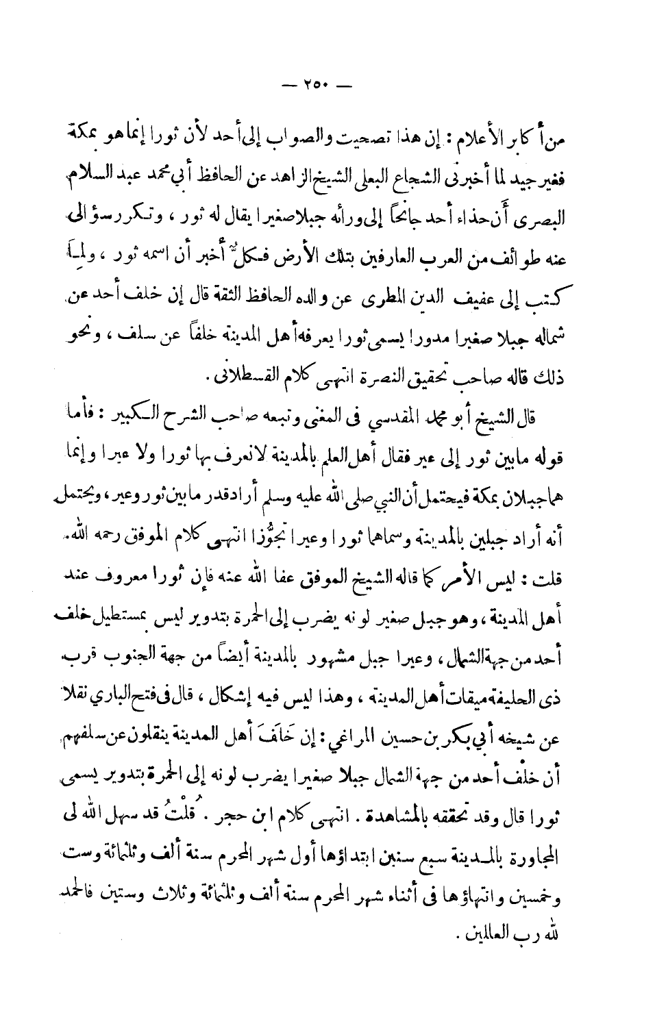 قال الشيخ أبو محمد المقدسي في المغني وتبعه صاحب الشرح الكبير: فأما قوله ما بين ثور إلى عير فقال أهل العلم بالمدينة لا نعرف بها ثوراً ولا عيراً وإنما هما جبلان بمكة فيحتمل أن النبي صلى الله عليه وسلم أراد قدر ما بين ثور وعير، ويحتمل أنه أراد جبلين بالمدينة وسماهما ثوراً وعيراً تجوزاً انتهى كلام الموفق رحمه الله. قلت: ليس الأمر كما قاله الشيخ الموفق عفا الله عنه فإن ثوراً معروف عند أهل المدينة، وهل جبل صغير لونه يضرب إلى الحمرة بتدوير ليس بمستطيل خلف أحد من جهة الشمال، وعيرا جبل مشهور بالمدينة أيضا من جهة الجنوب قرب ذي الحليفة ميقات أهل المدينة، وهذا ليس فيه إشكال، قال في فتح الباري نقلاً عن شيخه أبي بكر بن حسين المراغي: إن خلف أهل المدينة ينقلون عن سلفهم أن خلف أحد من جهة الشمال جبلاً صغيراً يضرب لونه إلى الحمرة بتدوير يسمى ثوراً قال وقد تحققه بالمشاهدة. انتهى كلام ابن حجر. قلت قد سهل الله لي المجاورة بالمدينة سبع سنين ابتداؤها أول شهر المحرم سنة ألف وثلثمائة وست وخمسين وانتهاؤها في أثناء شهر محرم سنة ألف وثلثمائة وثلاث وستين فالحمد لله رب العالمين.