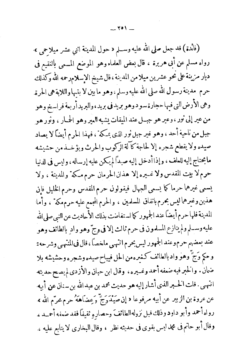 (فائدة) : قد جعل صلى الله عليه وسلم (حول المدينة اثني عشر ميلا حمى) رواه مسلم عن أبي هريرة، قال بعض العلماء وهو الموضع المسمى بالنقيع في ديار مزينة على نحو عشرين ميلا من المدينة. قال شيخ الإسلام رحمه الله وكذلك حرم مدينة رسول الله صلى الله عليه وسلم: وهو ما بين لابتيها واللابة هي الحرة وهي الأرض التي فيها حجار سود وهو بريد في بريد، والبريد أربعة فراسخ وهو من عير إلى ثور، وعير هو جبل عند الميقات يشبه العير وهو الحمار، وثور هو جبل من ناحية أُحد، وهو غير جبل ثور الذي بمكة، فهذا الحرم أيضاً لا يصاد صيده ولا يقطع شجره إلا لحاجة كآلة الركوب والحرث ويؤخذ من حشيشه ما يحتاج إليه للعلف، وإذا أدخل إليه صيداً لم يكن عليه إرساله، وليس في الدنيا حرم لا بيت المقدس ولا غيره إلا هذان الحرمان حرم مكة والمدينة، ولا يسمى غيرهما حرماً كما يسمى الجهال فيقولون حرن المقدس وحرم الخليل فإن هذين وغيرهما ليس بحرم باتفاق المسلمين، والحرم المجمع عليه حرم مكة، وأما المدينة فلها حرم أيضا عند الجمهور كما استفاضت بذلك الأحاديث عن النبي صلى الله عليه وسلم ولم ينازع المسلمون في حرم ثالث إلا في وج وهو واد بالطائف وهو عند بعضهم حرم وعند الجمهور ليس بحرم انتهى ملخصاً. قال في المنتهى وشرحه: وحكم وج وهو واد بالطائف كغيره من الحل فيباح صيده وشجره وحشيشه بلا ضمان. والخبر فيه ضعفه أحمد وغيره، وقال ابن حبان والأزدي لم يصح حديثه انتهى.