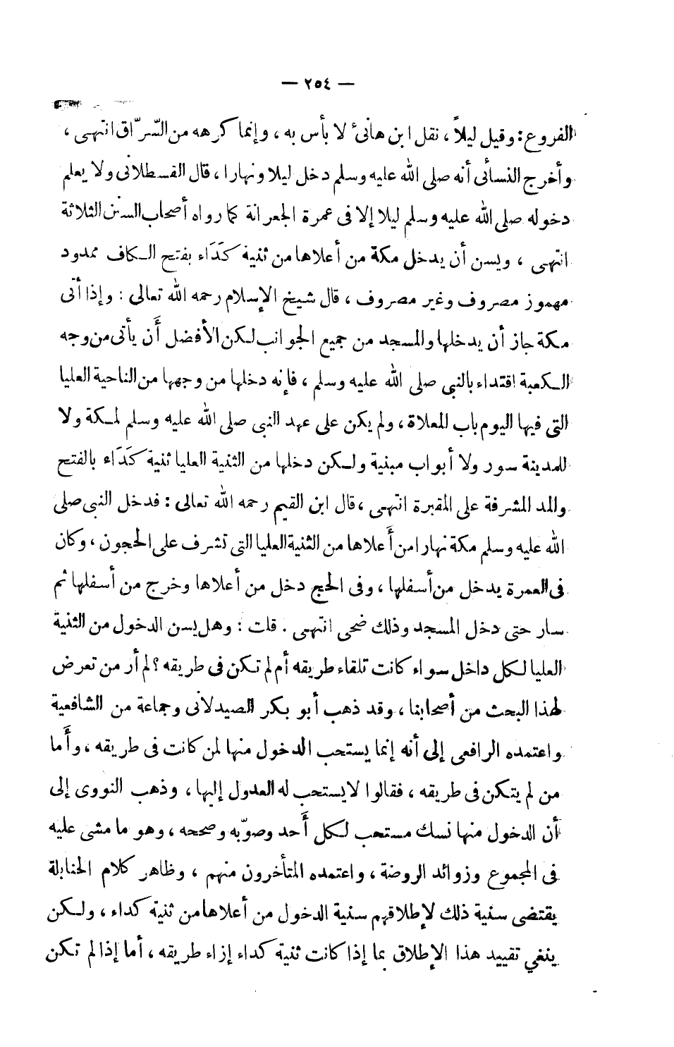 الفروع: وقيل ليلاً، نقل ابن هانئ لا بأس به، وإنما كرهه من السراق انتهى، وأخرج النسائي أنه صلى الله عليه وسلم دخل ليلاً ونهاراً، قال القسطلاني ولا يعلم دخوله صلى الله عليه وسلم ليلاً إلا في عمرة الجعرانة كما رواه أصحاب السنن الثلاثة انتهى. ويسن أن يدخل مكة من أعلاها من ثنية كداء بفتح الكاف ممدود مهموز مصروف وغيره مصروف، قال شيخ الإسلام رحمه الله تعالى: (وإذا أتى مكة جاز أن يدخلها والمسجد من جميع الجوانب لكن الأفضل أن يأتي من وجه الكعبة اقتداء بالنبي صلى الله عليه وسلم، فإنه دخلها من وجهها من الناحية العليا التي فيها اليوم باب المعلاة، ولم يكن على عهد النبي صلى الله عليه وسلم لمكة ولا للمدينة سور ولا أبواب مبنية ولكن دخلها من الثنية العليا ثنية كداء بالفتح والمد المشرفة على المقبرة انتهى، قال ابن القيم رحمه الله تعالى: فدخل النبي صلى الله عليه وسلم مكة نهاراً من أعلاها من الثنية العليا التي تشرف على الحجون، وكان في العمرة يدخل من أسفلها، وفي الحج دخل من أعلاها وخرج من أسفلها ثم سار حتى دخل المسجد وذلك ضحى انتهى.