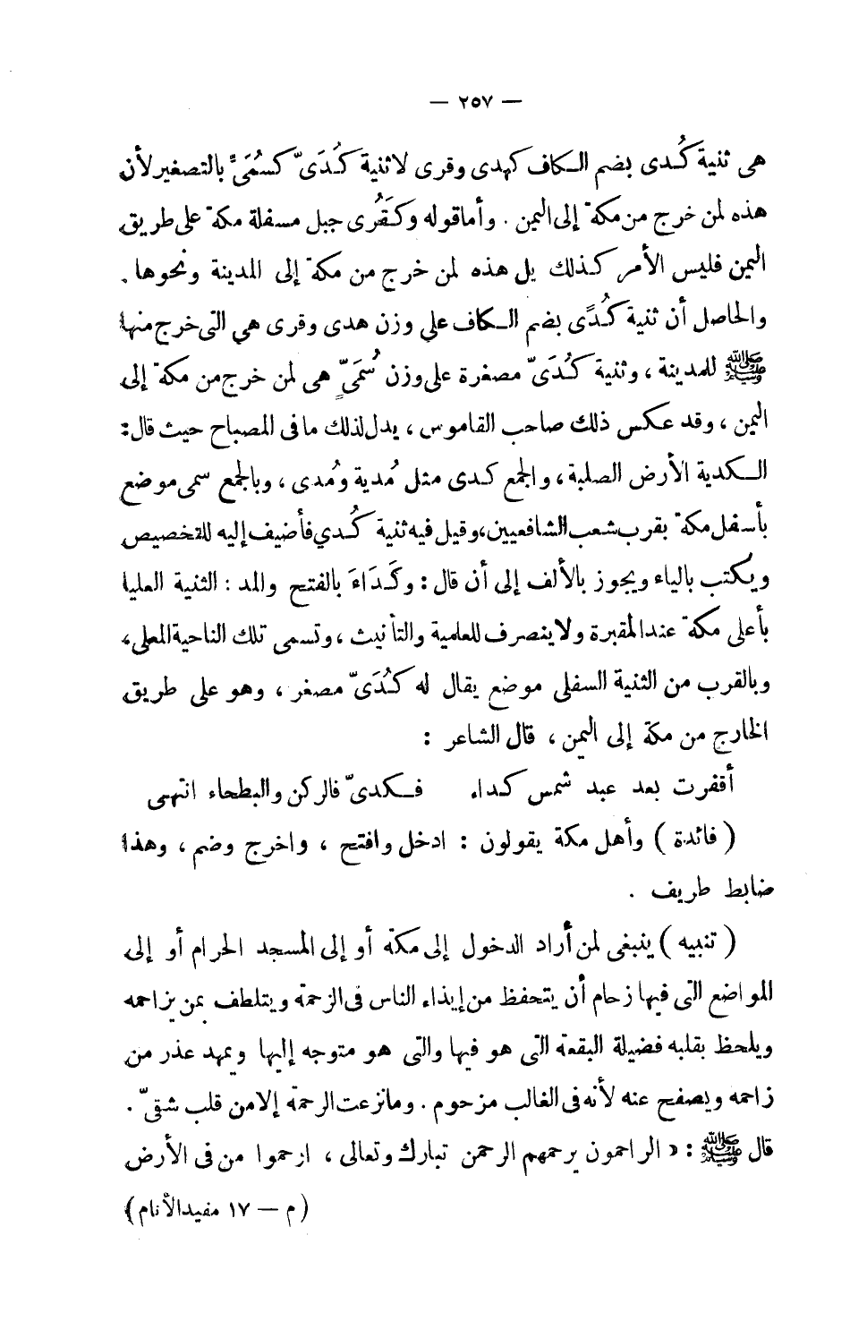 هي ثنية كدى بضم الكاف كهدي وقرى لا ثنية كدي كسمي بالتصغير لأن هذه لمن خرج من مكة إلى اليمن. وأما قوله وكقرى جبل مسفلة مكة على طريق اليمن فليس الأمر كذلك بل هذه لمن خرج من مكة إلى المدينة ونحوها. والحاصل أن ثنية كدى بضم الكاف على وزن هدى وقرى هي التي خرج منها صلى الله عليه وسلم للمدينة، وثنية كدى مصغرة على وزن سمي هي لمن خرج من مكة إلى اليمن، وقد عكس ذلك صاحب القاموس، يدل لذلك ما في المصباح حيث قال: الكدية الأرض الصلبة، والجمع كدى مثل مدية ومدى، وبالجمع سمي موضع بأسفل مكة بقرب شعب الشافعيين، وقيل فيه ثنية كدي فأضيف إليه للتخصيص ويكتب بالياء ويجوز بالألف إلى أن قال: وكداء بالفتح والمد: الثنية العليا بأعلى مكة عند المقبرة ولا ينصرف للعلمية والتأنيث، وتسمى تلك الناحية المعلى، وبالقرب من الثنية السفلى موضع يقال له كدي مصغر، وهو على طريق الخارج من مكة إلى اليمن، قال الشاعر: