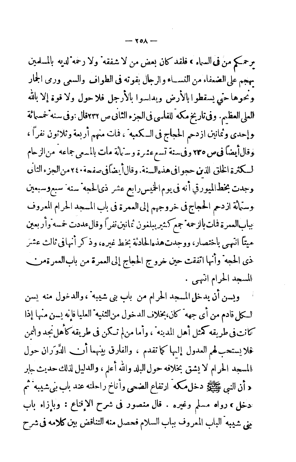 يرحمكم من في السماء) فلقد كان بعض من لا شفقة ولا رحمة لديه بالمسلمين يهجم على الضعفاء من النساء والرجال بقوته في الطواف والسعي ورمي الجمار ونحوها حتى يسقطوا بالأرض ويدسوا بالأرجل فلا حول ولا قوة إلا بالله العلي العظيم. وفي تاريخ مكة للفاسي في الجزء الثاني ص 232 قال: وفي سنة خمسائة وأحدى وثمانين ازدحم الحجاج في الكعبة، فمات منهم أربعة وثلاثون نفراً، وقال أيضاً في ص235 وفي سنة تسع عشرة وستمائة مات بالمسعى جماعة من الزحام لكثرة الخلق الذي حجوا في هذه السنة. وقال أيضا في صفحة 240 من الجزء الثاني وجدت بخط الميورقي أنه في يوم الخميس رابع عشر ذي الحجة سنة سبع وسبعين وستمائة ازدحم الحجاج في خروجهم إلى العمرة في باب المسجد الحرام المعروف بباب العمرة فمات بالزحمة جمع كثير يبلغون ثمانين نفراً وقال عددت خمسة وأربعين ميتاً انتهى باختصار، ووجدت هذه الحادثة بخط غيره، وذكر أنها في ثالث عشر ذي الحجة وأنها اتفقت حين خروج الحجاج إلى العمرة من باب العمرة من المسجد الحرام انتهى.