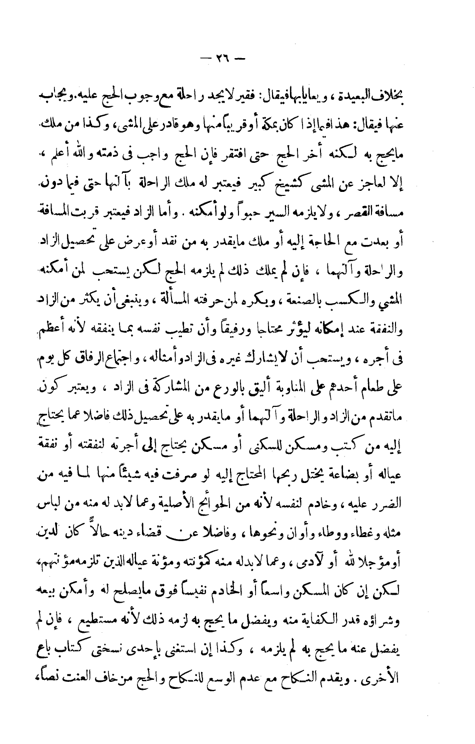 وأما الزاد فيعتبر، قربت المسافة أو بعدت مع الحاجة إليه أو ملك ما يقدر به من نقد أو عرض على تحصيل الزاد والراحلة وآلتهما، فإن لم يملك ذلك لم يلزمه الحج لكن يستحب لمن أمكنه المشي والكسب بالصنعة، ويكره لمن حرفته المسألة، وينبغي أن يكثر من الزاد والنفقة عند إمكانه ليؤثر محتاجاً ورفيقاً، وأن تطيب نفسه بما ينفقه لأنه أعظم في أجره، ويستحب أن لا يشارك غيره في الزاد وأمثاله، واجتماع الرفاق كل يوم على طعام أحدهم على المناوبة أليق بالورع من المشاركة في الزاد، ويعتبر كون ما تقدم من الزاد والراحلة وآلتهما أو ما يقدر به على تحصيل ذلك فاضلا عما يحتاج إليه من كتب ومسكن للسكنى أو مسكن يحتاج إلى أجرته لنفقته أو نفقة عياله أو بضاعة يختل ربحها المحتاج إليه لو صرف فيه شيئاً منها لما فيه من الضرر عليه، وخادم لنفسه لأنه من الحوائج الأصلية وعما لا بد له منه من لباس مثله وغطاء ووطاء وأوان ونحوها، وفاضلاً عن قضاء دينه حالا كان الدين أو مؤجلا لله أو لآدمي، وعما لا بد له منه كمؤنثه ومؤنة عياله الذين تلزمه مؤنتهم، لكن إن كن المسكن واسعاً أو الخادم نفسياً فوق ما يصلح له وأمكن بيعه وشراؤه قدر الكفاية منه ويفضل ما يحج به، لزمه ذلك لأنه مستطيع، فإن لم يفضل عنه ما يحج به لم يلزمه، وكذا إن استغنى بإحدى نسختي كتاب باع الأخرى. ويقدم النكاح مع عدم الوسع للنكاح والحج من خاف العنت نصا.