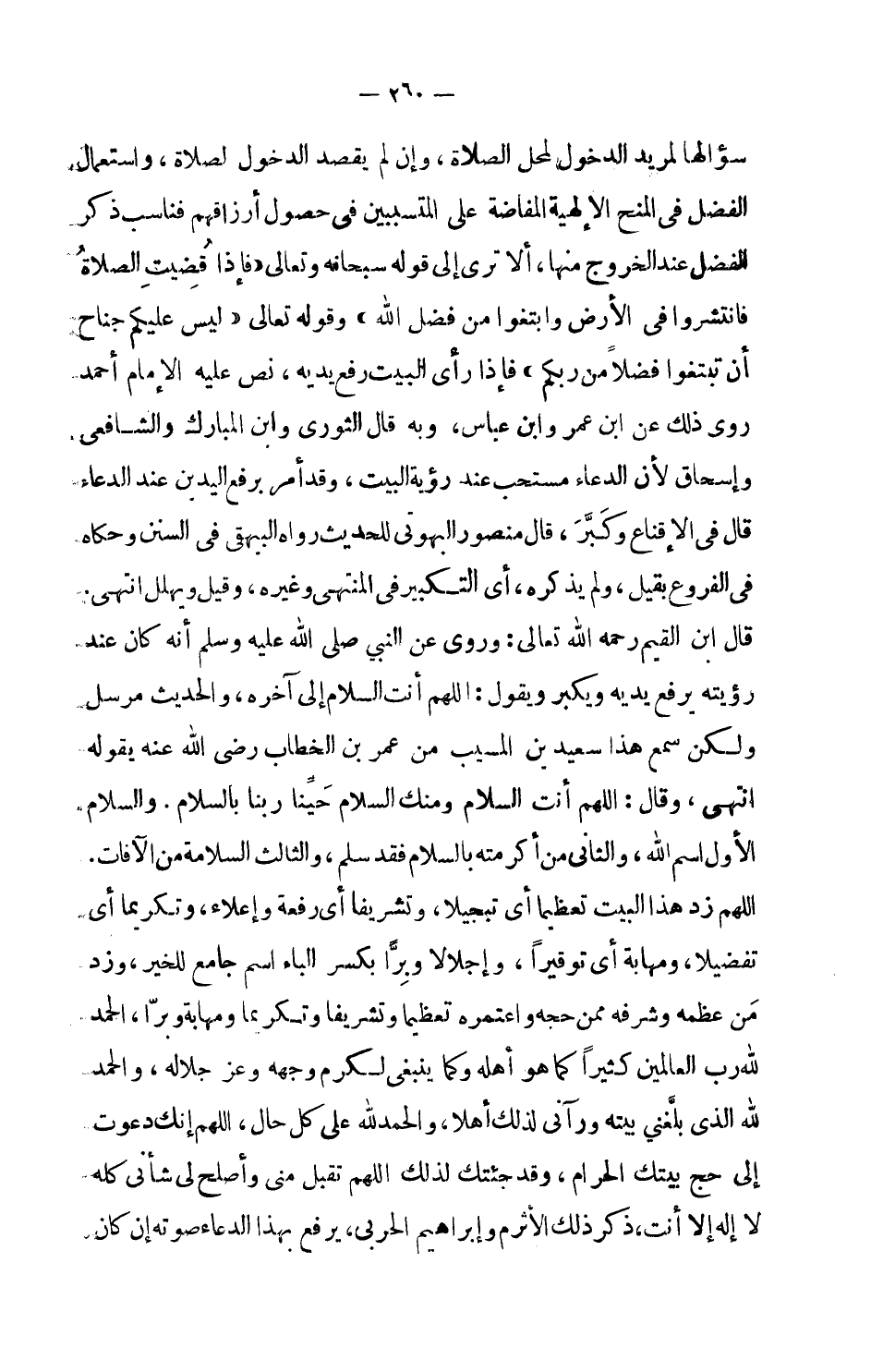 سؤالها لمريد الدخول لمحل الصلاة، وإن لم يقصد الدخول لصلاة، واستعمال الفضل في المنح الإلهية المفاضة على المتسببين في حصول أرزاقهم فناسب ذكر الفضل عند الخروج منها، ألا ترى إلى قوله سبحانه وتعالى: (فإذا قضيت الصلاة فانتشروا في الأرض وابتغوا من فضل الله) وقوله تعالى: (ليس عليكم جناح أن تبتغوا فضلاً من ربكم) فإذا رأى البيت رفع يديه، نص عليه الإمام أحمد روى ذلك عن ابن عمر وابن عباس، وبه قال الثوري وابن المبارك والشافعي وإسحاق لأن الدعاء مستحب عند رؤية البيت، وقد أمر برفع اليدين عند الدعاء قال في الإقناع وكبر، قال منصور واليهوتي للحديث رواه البيهقي في السنن وحكاه في الفروع بقيل، ولم يذكره، أي التكبير في المنتهى وغيره، وقيل ويهلل انتهى.