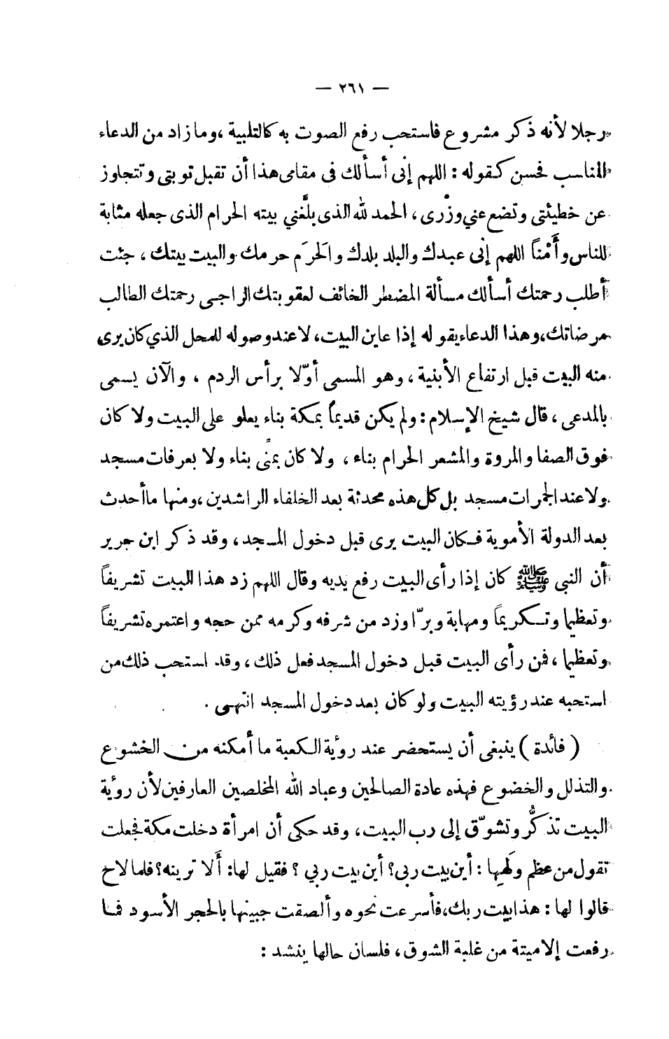 (فائدة) : ينبغي أن يستحضر عند رؤية الكعبة ما أمكنه من الخشوع والتذلل والخضوع فهذه عادة الصالحين وعباد الله المخلصين العارفين لأن رؤية البيت تذكر وتشوق إلى رب البيت، وقد حكي أن امرأة دخلت مكة فجعلت تقول من عظم ولها: أين بيت ربي؟ أين بيت ربي؟ فقيل لها: ألا ترينه؟ فلما لاح قالوا لها: هذا بيت ربك، فأسرعت نحوه وألصقت جبينها بالحجر الأسود فما رفعت إلا ميتة من غلبة الشوق، فلسان حالها ينشد: جئتك لذلك اللهم تقبل مني وأصلح لي شأني كله لا إله إلا أنت، ذكر ذلك الأثرم وإبراهيم الحربي، يرفع بذا الدعاء صوته إن كان رجلاً لأنه ذكر مشروع فاستحب رفع الصوت به كالتلبية، وما زاد من الدعاء المناسب فحسن كقوله: اللهم إني أسألك في مقامي هذا أن تقبل توبتي وتتجاوز عن خطيئتي وتضع عني وزري، الحمد لله الذي بلغني بيته الحرام الذي جعله مثابة للناس وأمناً اللهم إني عبدك والبلد بلدك والحرم حرمك والبيت بيتك، جئت أطلب رحمتك أسألك مسألة المضطر الخائف لعقوبتك الراجي رحمتك الطالب مرضاتك، وهذا الدعاء يقوله إذا عاين البيت، لا عند وصوله للمحل الذي كان يرى منه البيت قبل ارتفاع الأبنية، وهو المسمى أولاً برأس الردم، والآن يسمى بالمدعي، قال شيخ الإسلام: ولم يكن قديماً بمكة بناء يعلو على البيت ولا كان فوق الصفا والمروة والمشعر الحرام بناء، ولا كان بمنى بناء ولا بعرفات مسجد ولا عند الجمرات مسجد بل كل هذه محدثة بعد الخلفاء الراشدين، ومنها ما أحدث بعد الدولة الأموية فكان البيت يرى قبل دخول المسجد وقد ذكر ابن جرير أن النبي صلى الله عليه وسلم كان إذا رأى البيت رفع يديه وقال اللهم زد هذا البيت تشريفاً وتعظيماً وتكريماً ومهابة وبراً وزد من شرفه وكرمه ممن حجة واعتمره تشريفاً وتعظيماً وتكريماً فمن رأى البيت قبل دخول المسجد فعل ذلك، وقد استحب ذلك من استحبه عند