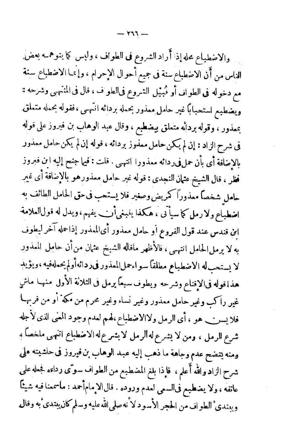 قلت: فيما جنح إليه ابن فيروز نظر، قال الشيخ عثمان النجدي: قوله غير حامل معذور وهو بالإضافة أي غير حامل شخصاً معذوراً كمريض وصغير فلا يستحب في حق الحامل الطائف به اضطباع ولا رمل كما سيأتي، هكذا ينبغي أن يفهم، ويدل هل قول العلامة ابن قندس عند قول الفروع أو حامل معذور أي المعذور إذا حمله آخر ليطوف به لا يرمل الحامل انتهى. فالأظهر ما قاله الشيخ عثمان من أن حامل المعذور لا يستحب له الاضطباع مطلقاً سواء حمل المعذور في ردائه أو لم يحمله فيه، ويؤيد هذا قوله في الإقناع وشرحه ويطوف سبعاً يرمل في الثلاثة الأول منها ماش غير راكب وغير حامل معذور وغير نساء وغير محرم من مكة أو من قربها فلا يسن هو، أي الرمل ولا الاضطباع، لهم لعدم وجود المعنى الذي لأجله شرع الرمل، ومن لا يشرع له الرمل لا يشرع له الاضطباع انتهى ملخصاً، ومنه يتضح عدم وجاهة ما ذهب إليه عبد الوهاب بن فيروز في حاشيته على شرح الزاد والله أعلم، فإذا فرغ المضطبع من الطواف سوى رداءه فجعله على عاتقه، ولا يضطبع في السعي لعدم وروده.