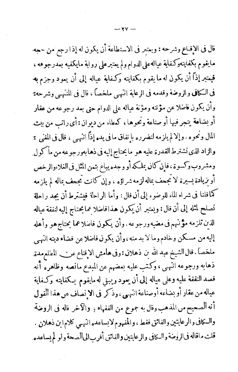قال الشيخ عبد الله بن ذهلان: وفي هامش الإقناع عن المطلع مدة ذهابه ورجوعه انتهى. وكتب عليه بعضهم عن المبدع ما نصه وظاهره أنه قصد النفقة عليه وعلى عياله إلى أن يعود ويبقى له ما يقوم بكفايته وكفاية عياله من عقار أو بضاعة أو صناعة انتهى.