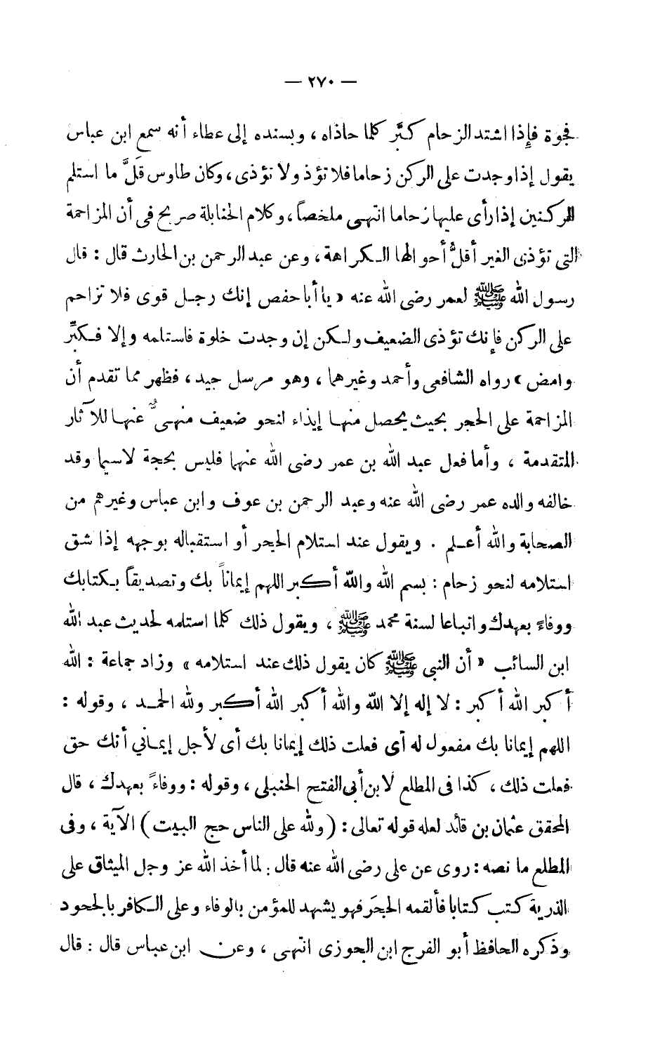 رأى عليهما زحاماً انتهى ملخصاً، وكلام الحنابلة صريح في أن المزاحمة التي تؤذي الغير أقل أحوالها الكراهة، وعن عبد الرحمن بن الحارث قال: قال رسول الله صلى الله عليه وسلم لعمر رضي الله عنه (يا أبا حفص إنك رجل قوي فلا تزاحم على الركن فإنك تؤذي الضعيف ولكن إن وجدت خلوة فاستلمه وإلا فكبِّر وامض) رواه الشافعي وأحمد وغيرهما، وهو مرسل جيد، فظهر مما تقدم أن المزاحمة على الحجر بحيث يحصل منها إذاء لنحو ضعيف منهي عنها للآثار المتقدمة، وأما فعل عبد الله بن عمر رضي الله عنهما فليس بحجة لا سيما وقد خالفه والده عمر رضي الله عنه وعبد الرحمن بن عوف وابن عباس وغيرهم من الصحابة والله أعلم، ويقول عند استلام الحجر أو استقباله بوجهه إذا شق استلامه لنحو زحام: بسم الله والله أكبر اللهم إيماناً بك وتصديقاً بكتابك ووفاء بعهدك واتباعا لسنة محمد نبيك صلى الله عليه وسلم، ويقول ذلك كلما استلمه لحديث عبد الله بن السائب (أن النبي صلى الله عليه وسلم كان يقول ذلك عند استلامه) وزاد جماعة: الله أكبر الله أكبر لا إله إلا الله والله أكبر الله أكبر ولله الحمد، وقوله: اللهم إيماناً بك مفعول له أي فعلت ذلك إيماناً بك أي لأجل إيماني أنك حق فعلت ذلك، كذا في المطلع لابن أبي الفتح الحنبلي، وقوله: ووفاءً بعهدك، قال المحقق عثمان بن قائد لعله قوله تعالى: (ولله على الناس حج البيت) . الآية، وفي المطلع ما نصه: روي عن علي رضي الله عنه قال: لما أخذ الله عز وجل الميثاق على الذرية كتب كتاباً فألقمه الحجر فهو يشهد للمؤمن بالوفاء وعلى الكافر بالجحود وذكره الحافظ أبو الفرج بن الجوزي انتهى.