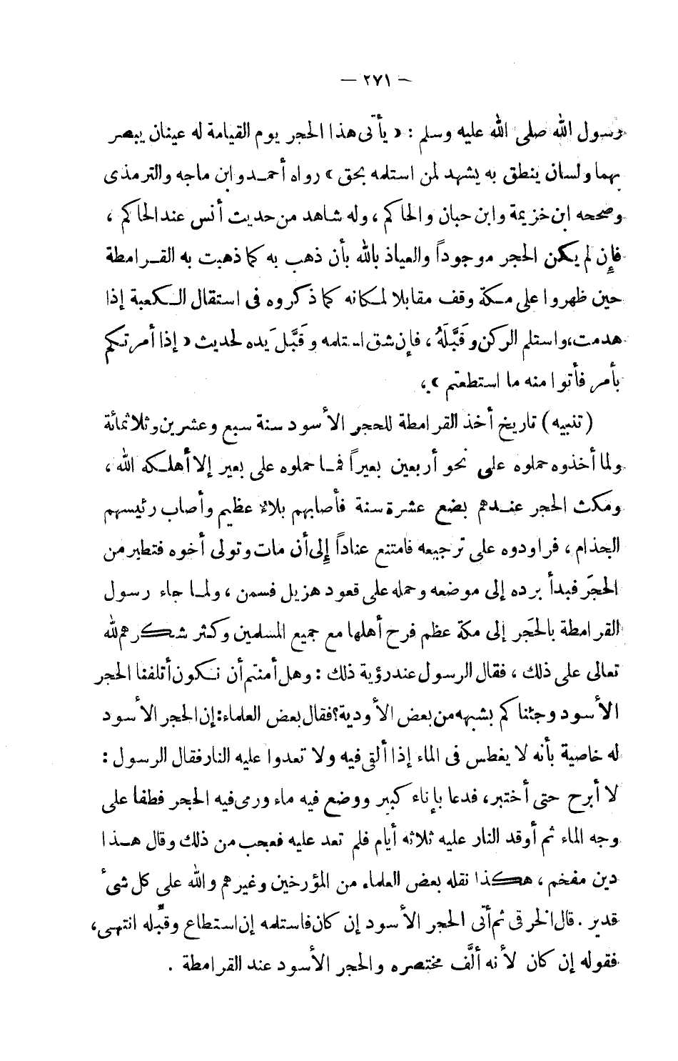 (تنبيه) : تاريخ أخذ القرامطة للحجر الأسود سنة سبع وعشرين وثلاثمائة ولما أخذوه حملوه على نحو أربعين بعيراً فما حملوه على بعير إلا أهلكه الله، ومكث الحجر عندهم بضع عشرة سنة فأصابهم بلاء عظيم وأصاب رئيسهم الجذام، فراودوه على ترجيعه فامتنع عناداً إلى أن مات وتولى أخوه فتطير من الحجر فبدأ برده إلى موضعه وحمله على قعود هزيل فسمن، ولما جاء رسول القرامطة بالحجر إلى مكة عظم فرح أهلها مع جميع المسلمين وكثر شكرهم لله تعالى على ذلك، فال الرسول عند رؤية ذلك: وهل أمنتم أن نكون أتلفنا الحجر الأسود وجئناكم بشبهه من بعض الأودية؟ فقال بعض العلماء: إن الحجر الأسود له خاصية بأنه لا يغطس في الماء إذا ألقى فيه ولا تعدوا عليه النار فقال الرسول: لا أبرح حتى أختبر، فدعا بإناء كبير ووضع فيه ماء ورمى فيه الحجر فطفا على وجه الماء ثم أوقد النار عليه ثلاثة أيام فلم تعد عليه فعجب من ذلك وقال هذا دين مفخم، هكذا نقله بعض العلماء من المؤرخين وغيرهم والله على كل شيء قدير، قال الخرقي ثم أتى الحجر الأسود إن كان فاستلمه إن استطاع وقبِّله انتهى. فقوله إن كان لأنه ألّف مختصره والحجر الأسود عند القرامطة.