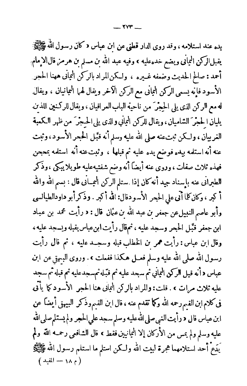 وذكر أبو داود الطيالسي وأبو عاصم النبيل عن جعفر بن عبد الله بن عثمان قال: (رأيت محمد بن عباد بن جعفر قبَّل الحجر وسجد عليه، ثم قال رأيت ابن عباس يقبله ويسجد عليه، وقال ابن عباس: رأيت عمر بن الخطاب قبله وسجد عليه، ثم قال رأيت رسول الله صلى الله عليه وسلم فعل هكذا ففعلت) . وروى البيهقي عن ابن عباس (أنه قبل الركن اليماني ثم سجد عليه ثم قبله ثم سجد عليه ثم قبله ثم سجد عليه ثلاث مرات) . قلت والمراد بالركن اليماني هنا الحجر الأسود كما يأتي في كلام ابن القيم رحمه الله وكما تقدم عنه، قال ابن القيم وذكر البيهقي أيضاً عن ابن عباس قال: (رأيت النبي صلى الله عليه وسلم سجد على الحجر ولم يستلم صلى الله عليه وسلم ولم يمس من الأركان إلا اليمانيين فقط) . قال الشافعي رحمه الله ولم يدع أحد استلامهما هجرة لبيت الله ولكن استلم ما استلم رسول الله صلى الله عليه وسلم