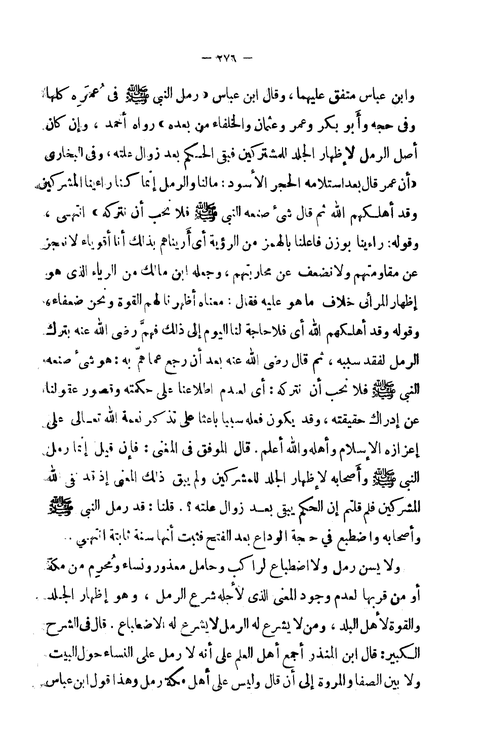وابن عباس متفق عليهما، وقال ابن عباس (رمل النبي صلى الله عليه وسلم في عُمره كلها وفي حجه وأبو بكر وعمر وعثمان والخلفاء من بعده) رواه أحمد، وإن كان أصل الرمل لإظهار الجلد للمشركين فبقى الحكم بعد زوال علته، وفي البخاري (أن عمر قال بعد استلامه الحجر الأسود: ما لنا والرمل إنما كنا رأينا المشركين وقد أهلكهم الله ثم قال شيء صنعه النبي صلى الله عليه وسلم فلا نحب أن نتركه) انتهى، وقوله: رأينا بوزن فاعلنا بالهمز من الرؤية أي أريناهم بذلك أنا أقوياء لا نعجز عن مقاومتهم ولا نضعف عن محاربتهم، وجعله ابن مالك من الرياء الذي هو إظهار المرائي خلاف ما هو عليه فقال: معناه أظهرنا لهم القوة ونحن ضعفاء، وقوله وقد أهلكهم الله أي فلا حاجة لنا اليوم إلى ذلك فهمَّ رضي الله عنه بترك الرمل لفقد سببه، ثم قال رضي الله عنه بعد أن رجع عما همّ به: هو شيء صنعه النبي صلى الله عليه وسلم فلا نحب أن نتركه: أي لعدم اطلاعنا على حكمته وقصور عقولنا عن إدراك حقيقته، وقد يكون فعله سبباً باعثاً على تذكر نعمة الله تعالى على إعزازه الإسلام وأهله والله أعلم.