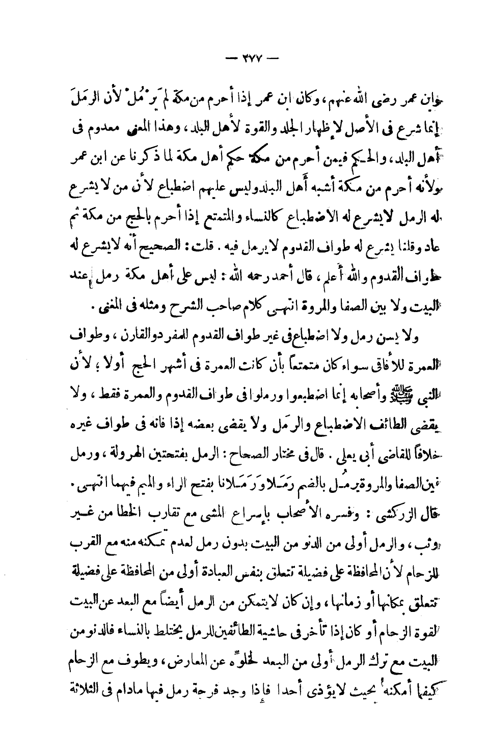 وابن عمر رضي الله عنهم، وكان ابن عمر إذا أحرم من مكة لم يرمل لأن الرمل إنما شرع في الأصل لإظهار الجلد والقوة لأهل البلد، وهذا المعنى معدوم في أهل البلد، والحكم فيمن أحرم من مكة حكم أهل مكة لما ذكرنا عن ابن عمر ولأنه أحرم من مكة أشبه أهل البلد وليس عليهم اضطباع لأن من لا يشرع له الرمل لا يشرع له الاضطباع كالنساء والمتمع إذا أحرم بالحج من مكة ثم عاد وقلنا يشرع له طواف القدوم لا يرمل فيه. قلت: الصحيح أنه لا يشرع له طواف القدوم والله أعلم، قال أحمد رحمه الله: ليس على أهل مكة رمل عند البيت ولا بين الصفا والمروة انتهى كلام صاحب الشرح ومثله في المغني.