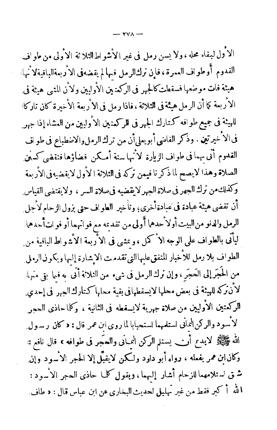 الأول لبقاء محله، ولا يسن رمل في غير الأشواط الثلاثة الأول من طواف القدوم أو طواف العمرة، فإن ترك الرمل فيها لم يقضه في الأربعة الباقية لأنها هيئة فات موضعها فسقطت كالجهر في الركعتين الأوليين ولأن المشي هيئة في الأربعة كما أن الرمل هيئة في الثلاثة، فإذا رمل في الأربعة الأخيرة كان تاركاً للهيئة في جميع طوافه كتارك الجهر في الركعتين الأوليين من العشاء إذا جهر في الأخيرتين.