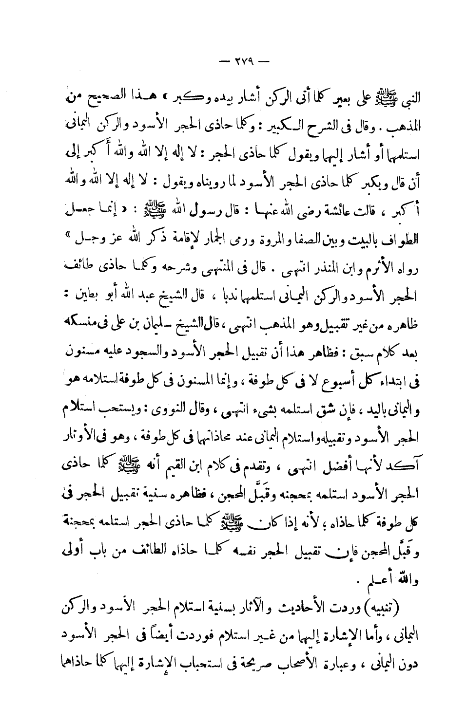 (تنبيه) : وردت الأحاديث والآثار بسنية استلام الحجر الأسود والركن اليماني، وأما الإشارة إليهما من غير استلام فوردت أيضاً في الحجر الأسود دون اليماني، وعبارة الأصحاب صريحة في استحباب الإشارة إليهما كلما حاذاهما
