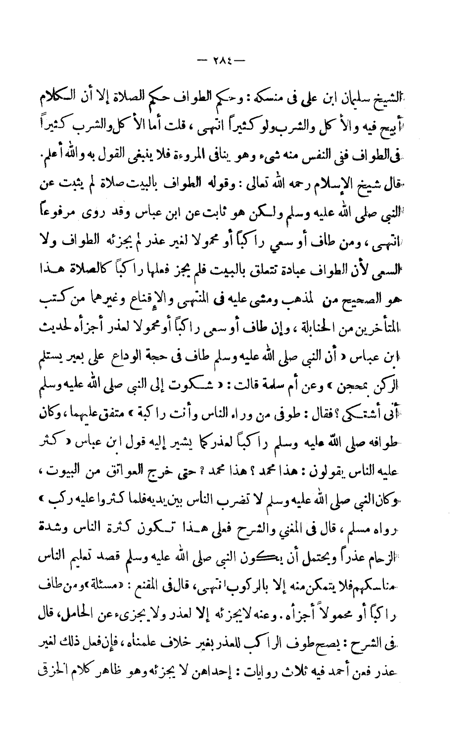 الشيخ سليمان ابن علي في منسكه: وحكم الطواف حكم الصلاة إلا أن الكلام أبيح فيه والأكل والشرب ولو كثيراً انتهى، قلت أما الأكل والشرب كثيراً في الطواف ففي النفس منه شيء وهو ينافي المروءة فلا ينبغي القول به والله أعلم. قال شيخ الإسلام رحمه الله تعالى: وقوله الطواف بالبيت صلاة لم يثبت عن النبي صلى الله عليه وسلم ولكن هو ثابت عن ابن عباس وقد روى مرفوعاً انتهى.