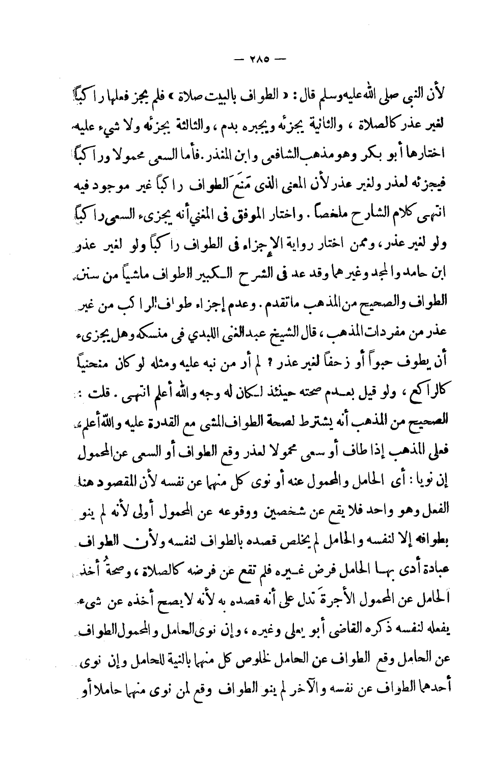 لأن النبي صلى الله عليه وسلم قال: (الطواف بالبيت صلاة) فلم يجز فعلها راكباً لغير عذر كالصلاة، والثانية يجزئه ويجبره بدم، والثالثة يجزئه ولا شيء عليه اختارها أبو بكر وهو مذهب الشافعي وابن المنذر. فأما السعي محمولاً وراكباً فيجزئه لعذر ولغير عذر لأن المعنى الذي منع الطواف راكباً غير موجود فيه انتهى كلام الشارح ملخصاً.